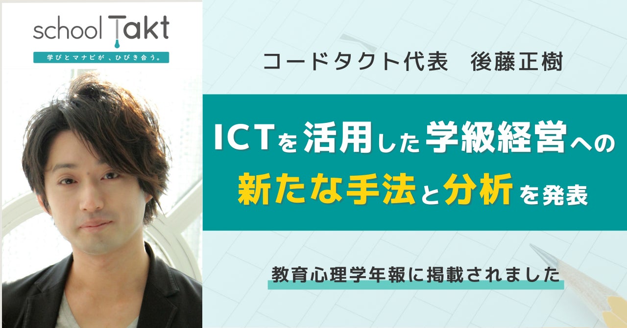 コードタクト代表取締役の後藤が、授業支援クラウド「スクールタクト」の行動ログを用いた実証実験の成果をもとに、ICT活用でもたらさせる学級経営への効果を発表。教育心理学年報に掲載されました。