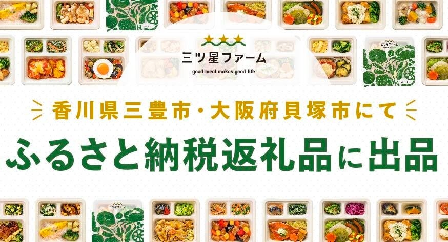 区、代表取締役社長兼CEO:黒川隆介)が運営する冷凍おかず定期便サービス「三ツ星ファーム」は、香川県三豊市と大阪府貝塚市のふるさと納税返礼品として出品することをお知らせします。寄附額に応じて5食、7食、10食、20食のセットから選択が可能で、忙しい日々を過ごす皆さまに、「三ツ星ファーム」の食事を通して少しでも手軽でおいしく幸せな時間を提供します。