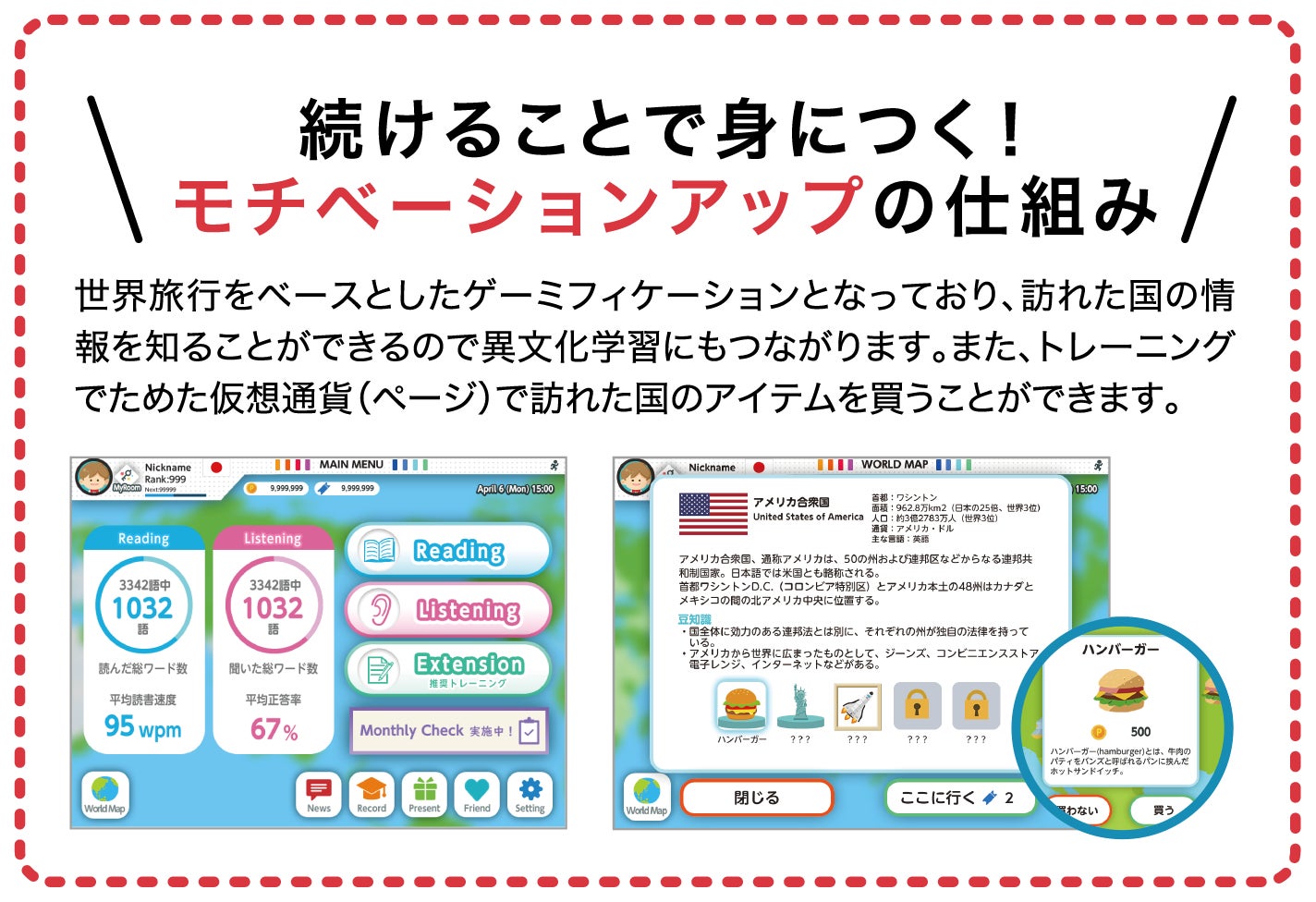 また、楽しみながらトレーニングを続けられる工夫として、世界旅行をベースとしたゲーミフィケーション要素を搭載しています。トレーニングでためた仮想通貨(ページ)で、訪れた国のアイテムをお土産として買うことができ、マイルームへコレクションしていくことができます。また、訪れた国の情報を知ることができるので異文化学習にもつながります。