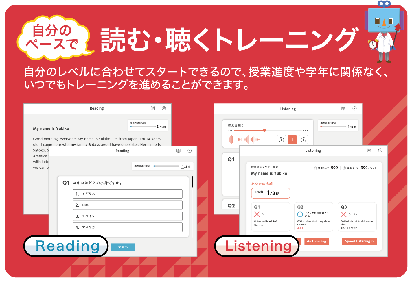 自身の読解力レベルに合わせて4つのコースから選択して受講でき、入試対策コンテンツや英検®などの民間試験対策コンテンツも搭載しています。