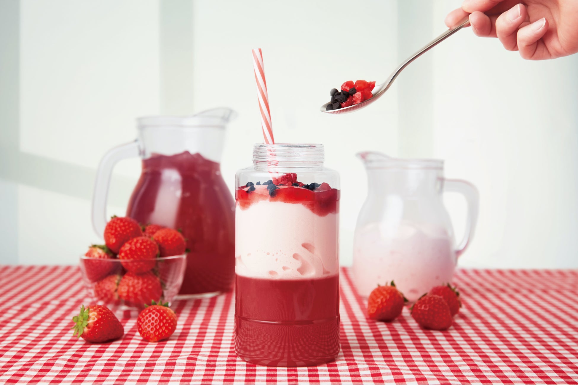 ボトル容器の口が大きい仕様になっているため、お好みの食べ方でお楽しみいただけるのも魅力の一つです。しっかりと振ってストローで飲めば、いちごミルクのような滑らかなドリンクに、ビスケットやゼリーの食感を楽しみたい方は、振る回数を控えめにし、スプーンでお召し上がりいただくのもおすすめです