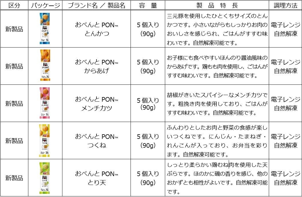 「おべんとPON™」シリーズより、お弁当の人気のおかずメニューを5種類(とんかつ、からあげ、メンチカツ、つくね、とり天)を展開します。収納スペースを取らずにストックできるので、まとめ買いしやすく、「おべんとPON™」5種類のおかずを組み合わせながら、メニュー検討に困ることなく毎日のお弁当づくりを楽しむことができます。また、パッケージをカラフルに色分けしているので、購入時や冷凍庫の中から取り出す時に、楽しさや分かりやすさを提供します。
