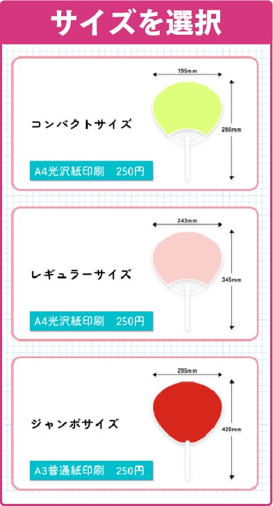 ※A4光沢紙(うちわサイズ:レギュラー、コンパクト)は、ファミリーマート・ローソン・ミニストップのみでの取り扱いとなります。