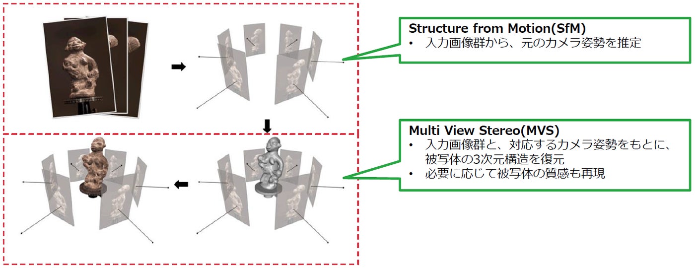 特にカメラ姿勢の推定までをSfM、それ以降をMVS として扱うことが多い(図は Furukawa, Yasutaka, and Carlos Hernández. "Multi-View Stereo: A Tutorial." より引用)