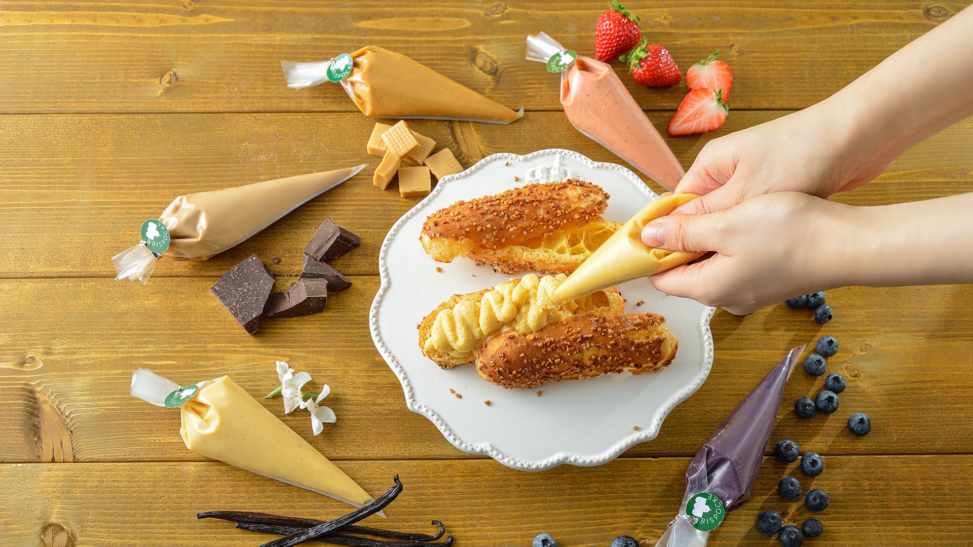 ご自身で絞り袋をカットして、お好きなクリームをお好きなだけ 絞ってください。