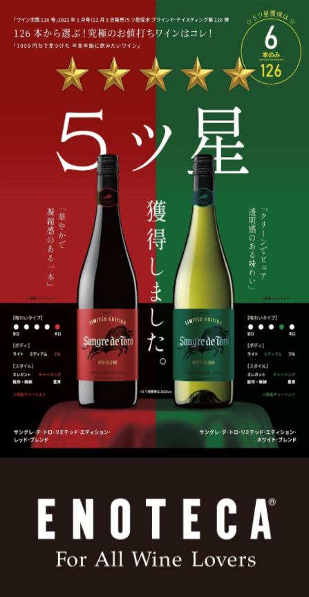 ③「ワイン王国」2022年1月号にて五ツ星を獲得したワイン「サングレ・デ・トロ・リミテッド・エディション・レッドブレンド」または「サングレ・デ・トロ・リミテッド・エディション・ホワイトブレンド」のいずれか1本を先着100本分プレゼント(※3)