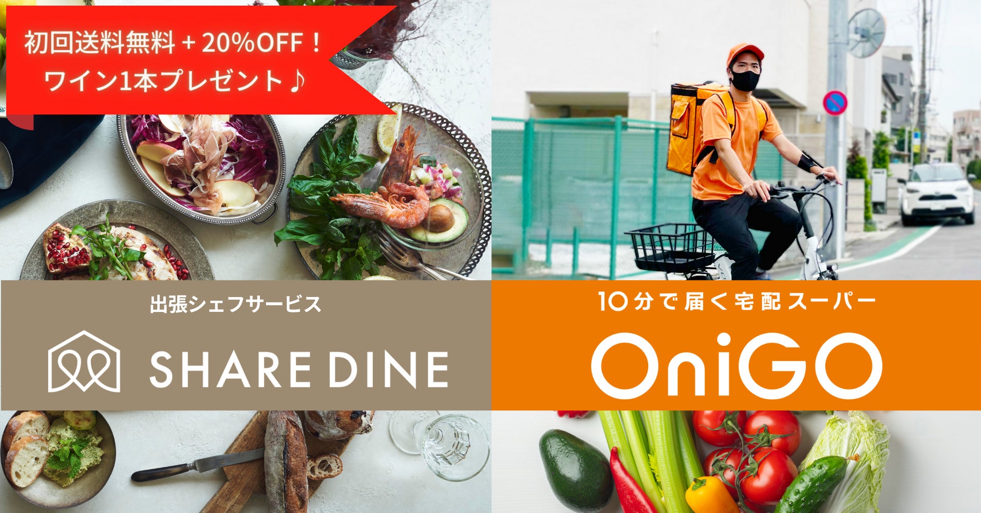 栄養士から一流レストランシェフまで約1,800名のシェフが登録する出張シェフサービス「シェアダイン」を運営する株式会社シェアダイン(共同代表:井出有希、本社:東京都港区、以下シェアダイン)は、10分で届く宅配スーパー「OniGO」を運営する株式会社OniGO(代表取締役:梅下直也、本社:東京都渋谷区、以下OniGO)と2021年12月22日よりサービス連携を開始いたします。