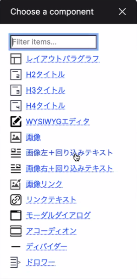 v1.3.0ではノーコーディングでページ制作を進められるKamihayaパラグラフを実装しました。Kamihayaパラグラフはよく使われるレイアウトパターンとデジタル庁コンポーネントの一部を取り込み、セレクトボタンと情報入力だけでページコンテンツを構築していくことができます。このことによりページ制作におけるレイアウト調整やコーディング作業を省き、スピーディーにページ制作を行うことができます。