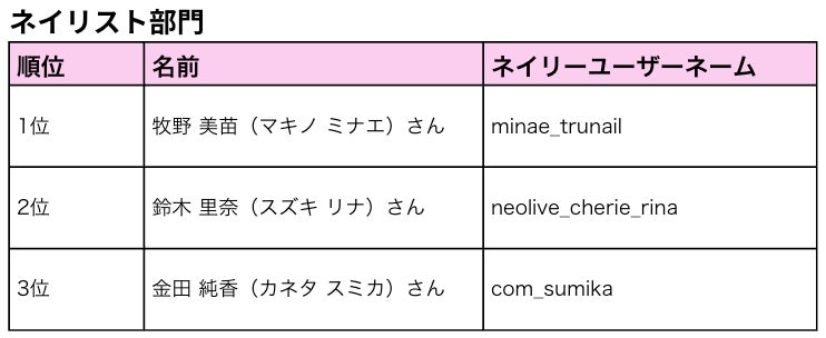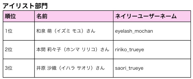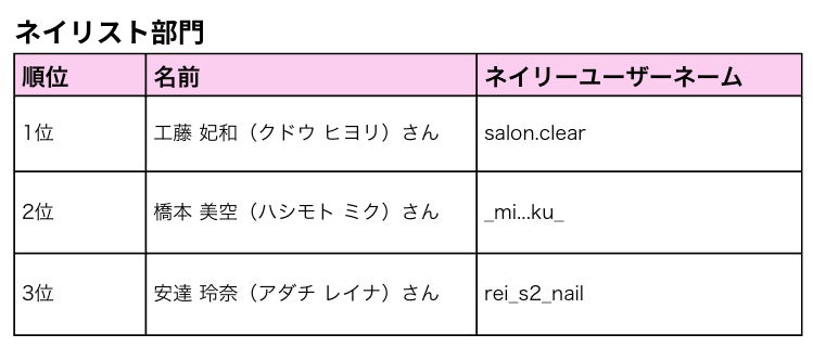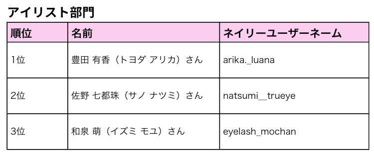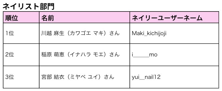今年ネイリーのアプリ内に投稿されたデザイン画像全91万枚のうち、最もユーザーの心をつかみ、人気だったデザイン画像を投稿されたネイリスト・アイリストとして、 各部門上位3名を表彰しました。