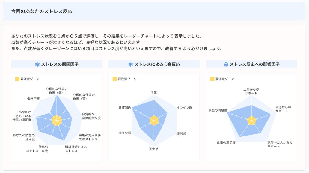従業員本人が自身のストレス状況を把握できるよう、わかりやすい診断結果を提供いたします。これにより、従業員の自己理解を促進し、必要な対策を講じるきっかけを提供いたします。