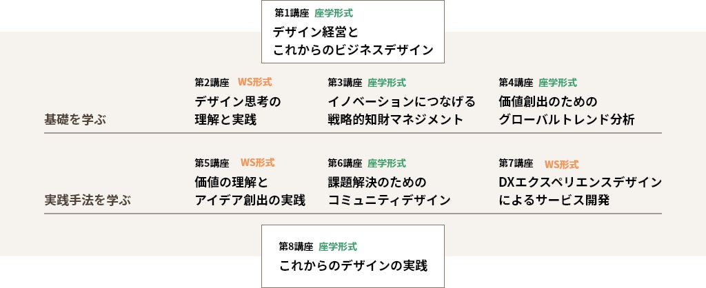 「デザイン経営」「ビジネスデザイン」「コミュニティデザイン」「知財マネジメント」「デザイン思考」などを網羅的、階層的に学ぶことで、マインドセットから「実践」へと理解をつないでいきます。