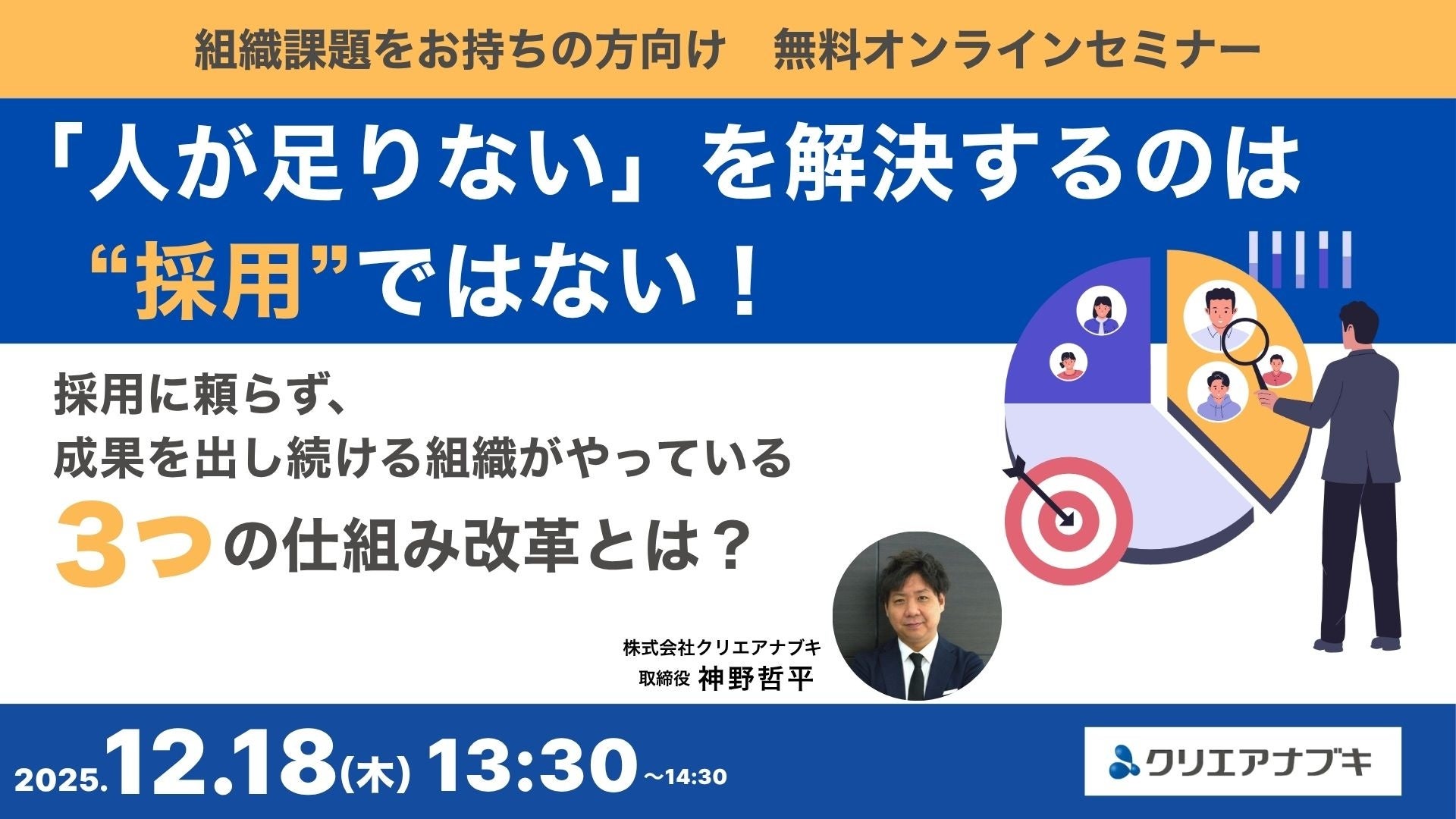 総合人材サービスの株式会社クリエアナブキ(本社:香川県高松市/代表取締役社長 楠戸 三則)は、2025年12月18日に無料オンラインセミナー「『人が足りない』を解決するのは、“採用”ではない!~採用に頼らず、成果を出し続ける組織がやっている3つの仕組み改革とは?」を開催します。