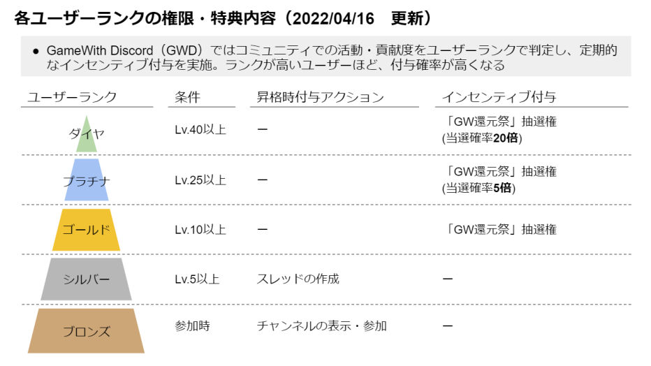 株式会社GameWith(本社:東京都港区、代表取締役社長:今泉卓也、証券コード:6552、以下「当社」)は、公式コミュニティGWDiscord(GWD)において『第1回GW(GameWith)還元祭』を開催いたします。お好きなゲームやAmazonギフト券が抽選で50名以上に当たる豪華キャンペーンで、GWDでの活動量が多いユーザーへの還元率が上がる仕組みをご用意しています。