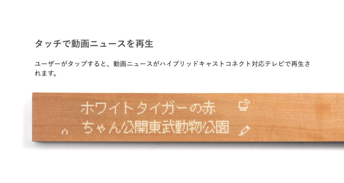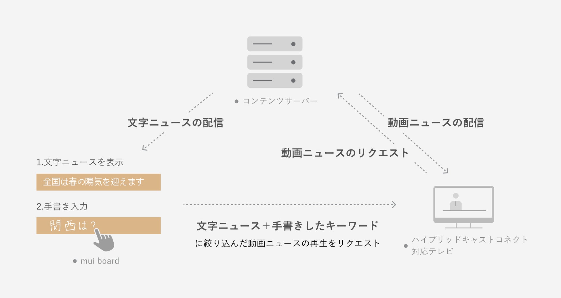 たとえば、リビングに設置されたmuiボードが、天気や電力使用量などの暮らしに役立つ情報を表示する中で、ユーザーの関心に合った文字ニュースを表示します。文字ニュースにタッチすると、テレビに関連するニュース動画が映し出されます。さらに詳しく知りたい場合は、muiボードにキーワードを手書きで入力することで、関連動画を絞り込んで再生することも可能です。