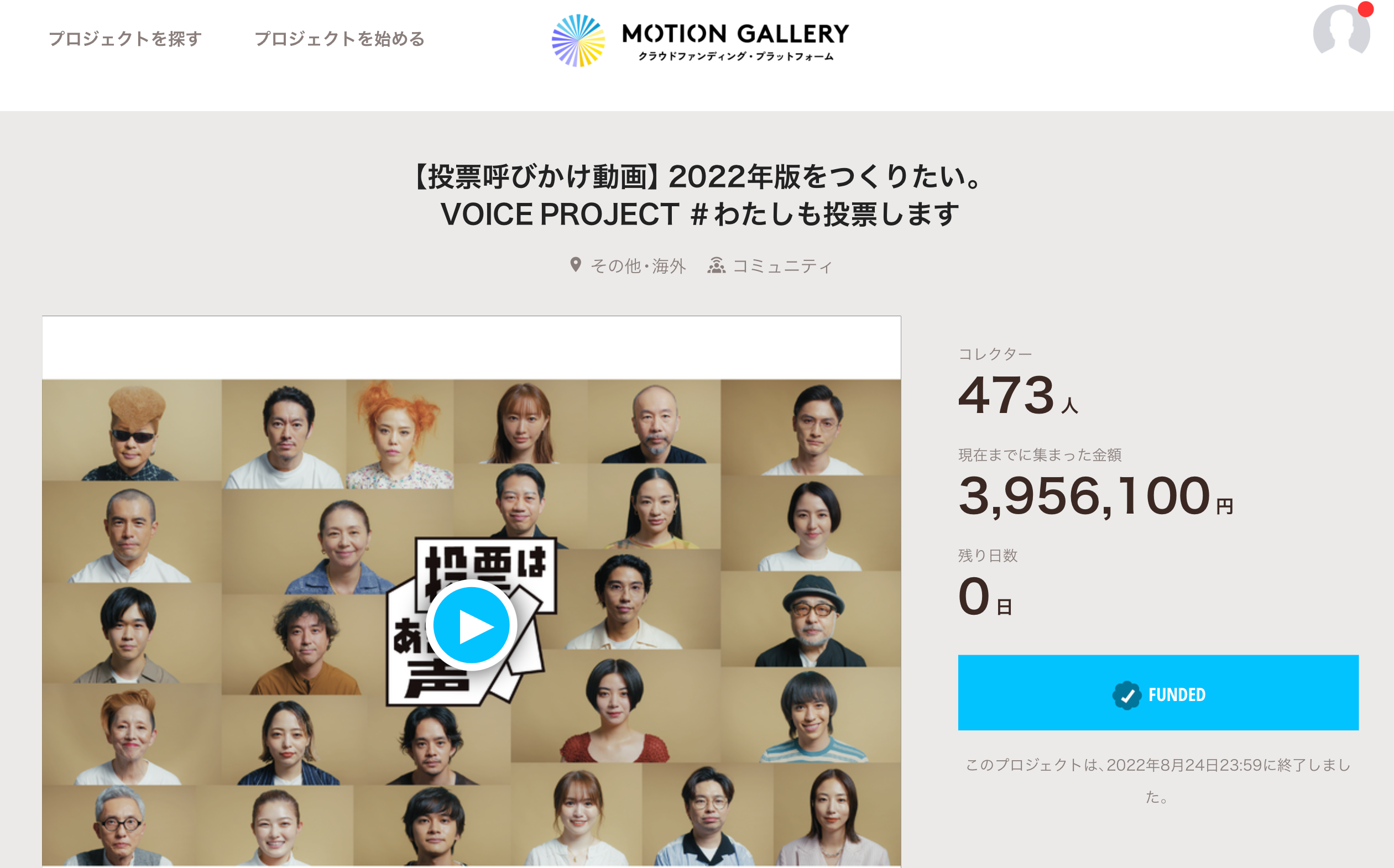 また、国連UNHCR協会との共同制作など、社会活動にも精力的に取り組んでおり、2013年に、社会的アート制作集団「NOddIN(ノディン)」として原発事故をテーマにした自主制作の発表展示の活動費をMOTION GALLERYのクラウドファンディングで募りました(https://motion-gallery.net/projects/noddin-exhibition)。今年6月には、『VOICE PROJECT』の発起人として、多くの俳優やミュージシャン、文化人と「投票」を呼び掛けるための映像を制作をし、制作費等を募り、各種メディアで取り上げられました(https://motion-gallery.net/ projects/voice-project)。