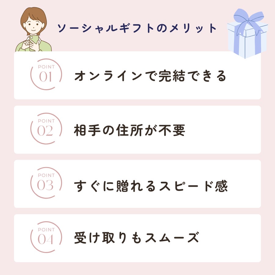 住所を知らない相手にも、SNSやメール、LINEなどでURLを送るだけでギフトを贈れます。オンラインでつながる相手にも贈りやすいのが特長です。