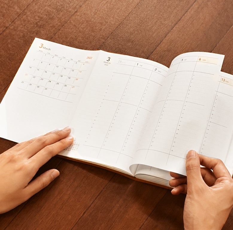 月間カレンダーは折り畳み式。広げると月間の予定と1週間の予定を見開き1ページで管理できます。スケジュール管理が面倒という心理的な敷居を下げました。