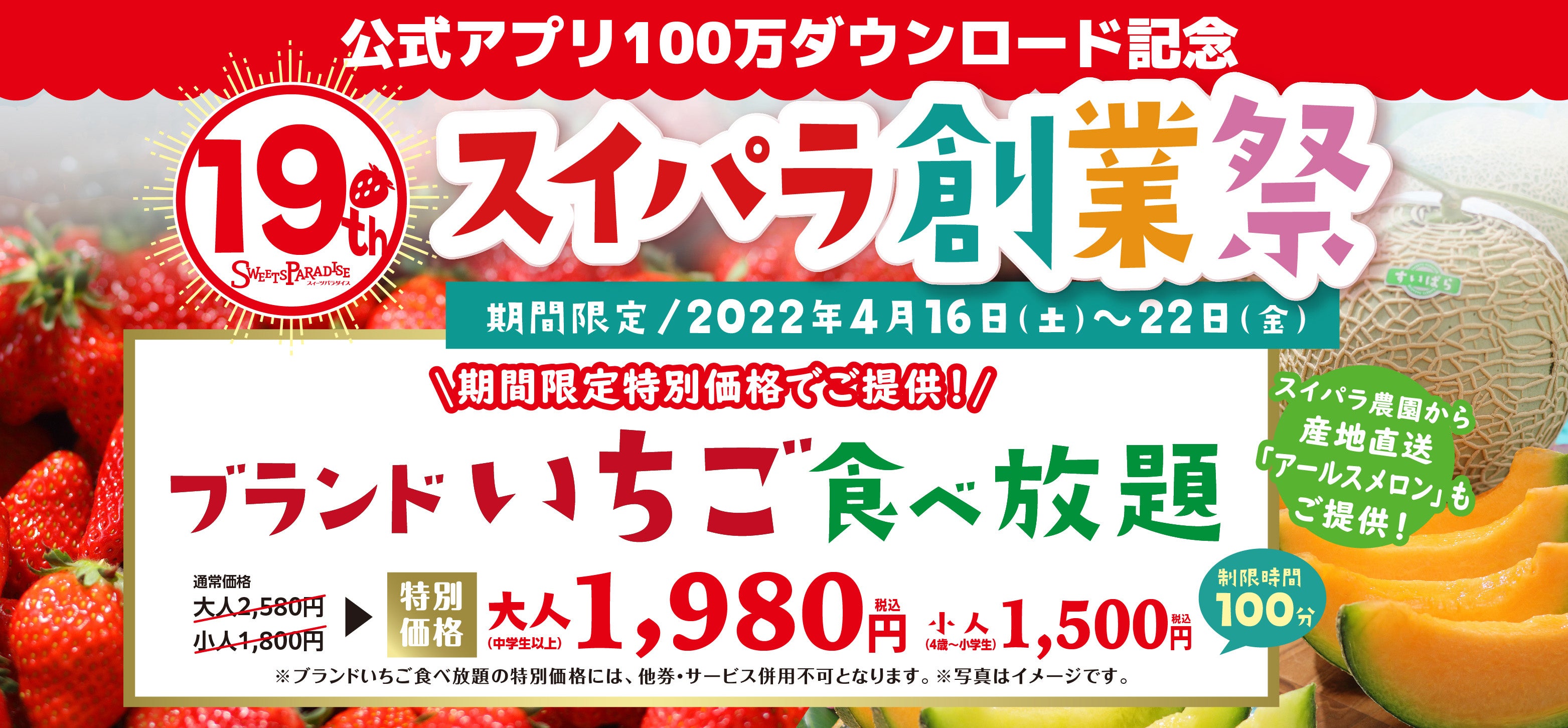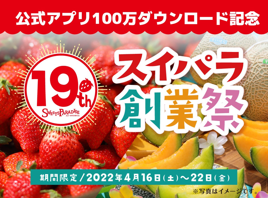 スイーツパラダイス(以下、スイパラ)は、今年で19周年を迎えます。また、スイパラが運営する公式アプリについても、おかげさまでこの度100万ダウンロードを突破!