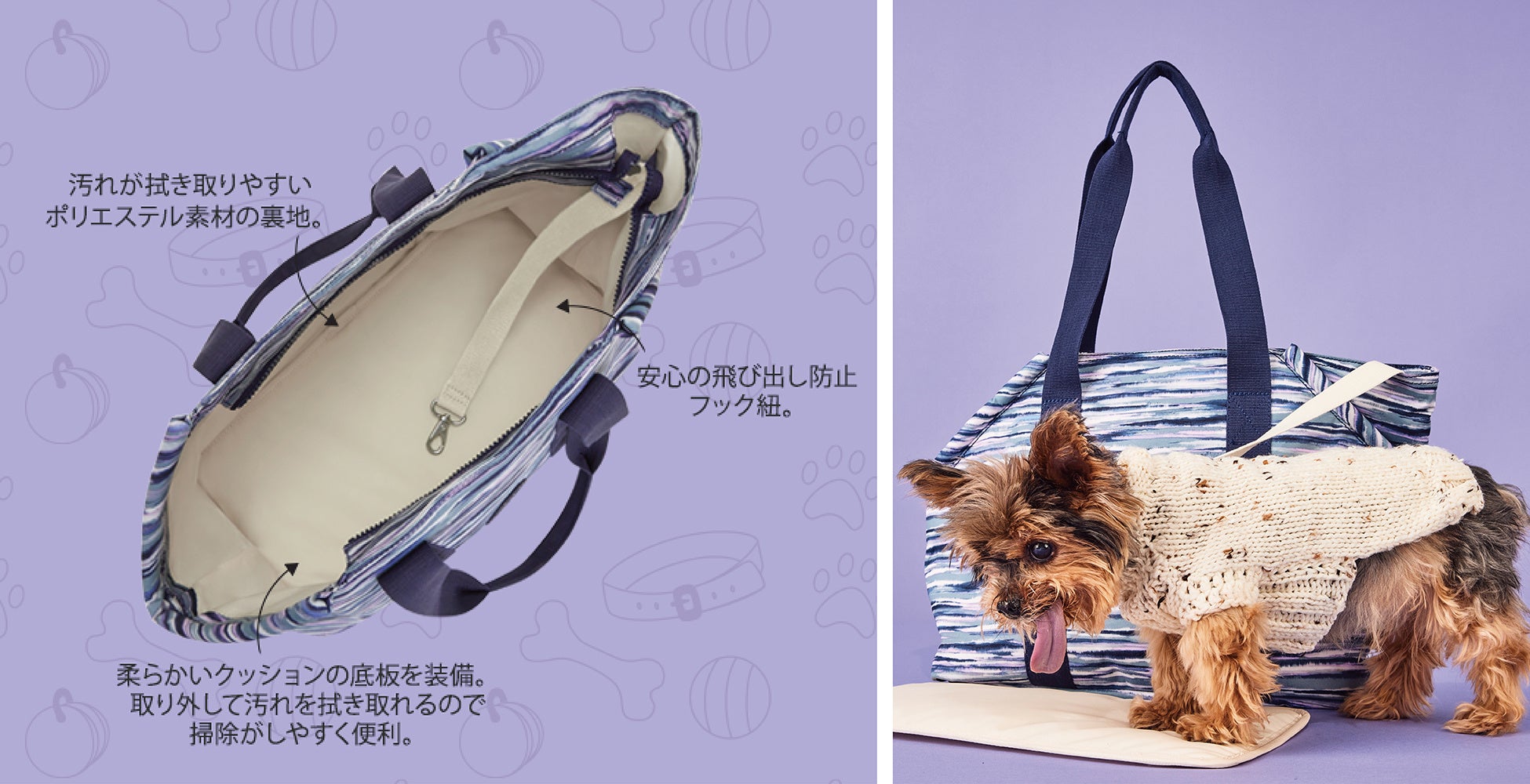 「アートエム ペットバッグ」の特徴はなんといってもその軽さです。キプリングならではの軽量素材を使用しバッグ自体の重さが740gと軽量なので、移動の際の飼い主さんの負担を軽減。底板は取り外しのできるクッションパッドになっているので愛犬にも優しく飼い主さんにとっても掃除もしやすく便利な仕様です。