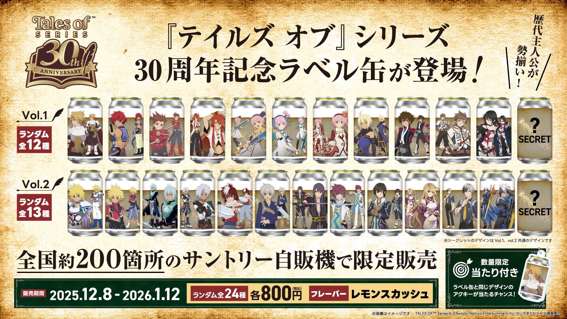 『テイルズ オブ』 シリーズ 30周年記念の限定オリジナルラベル缶が全国のサントリー自販機にて12月8日(月)より販売開始
