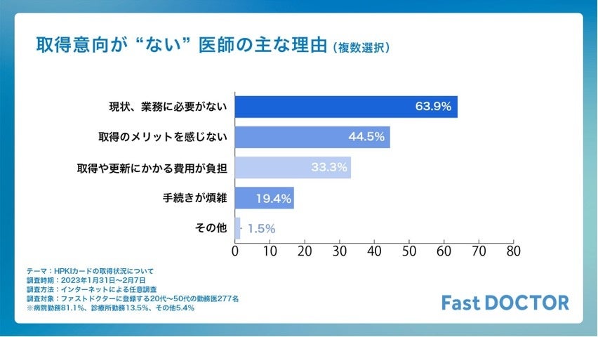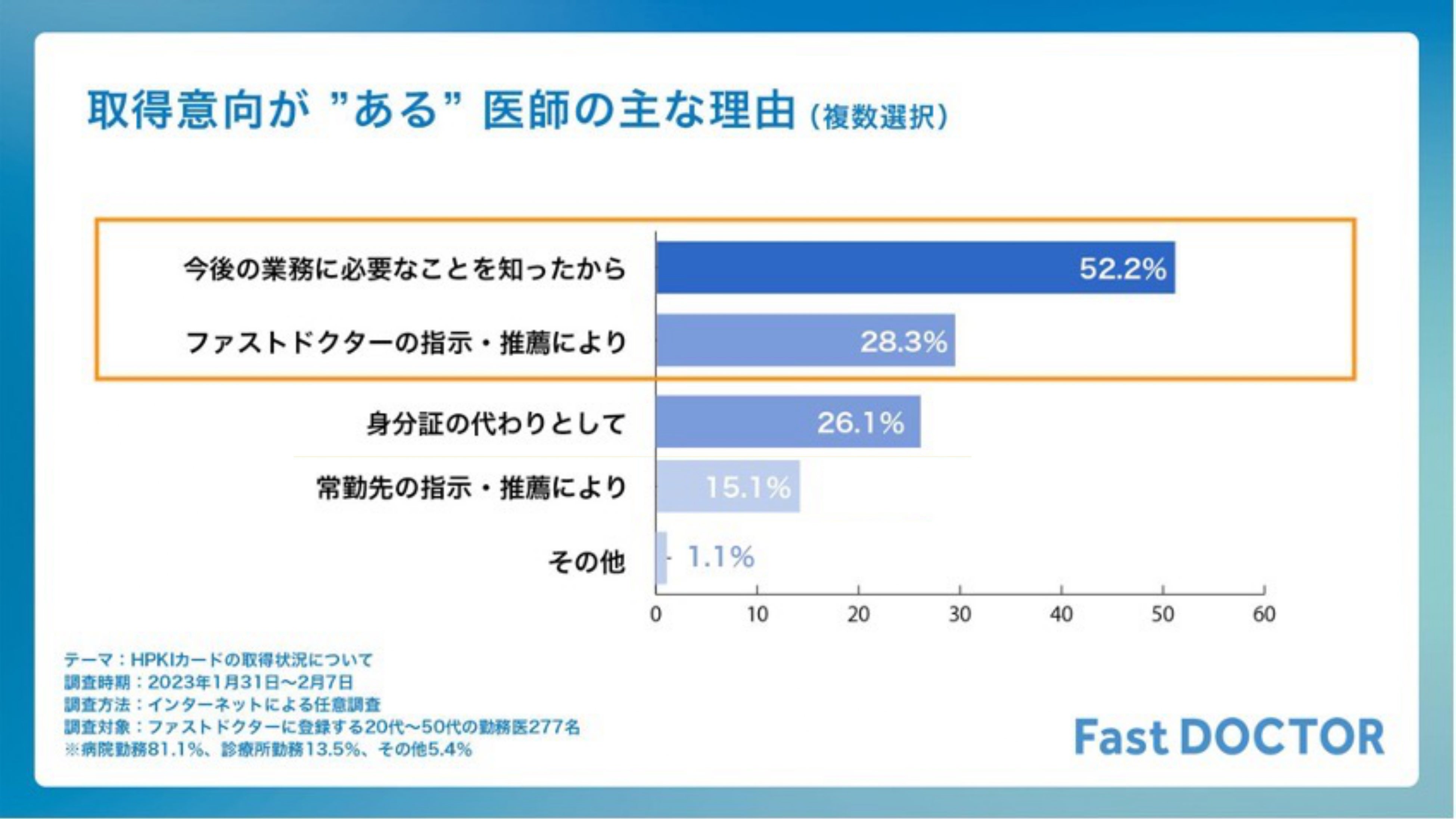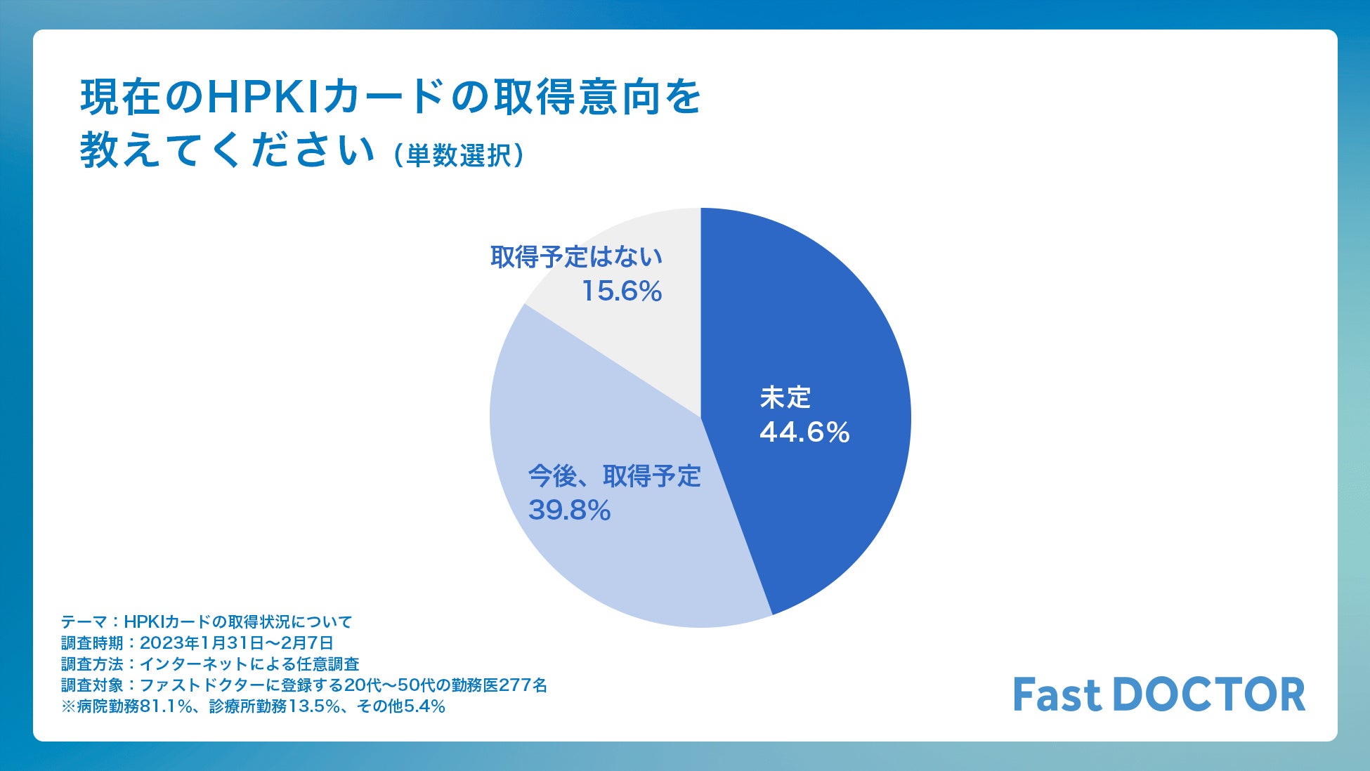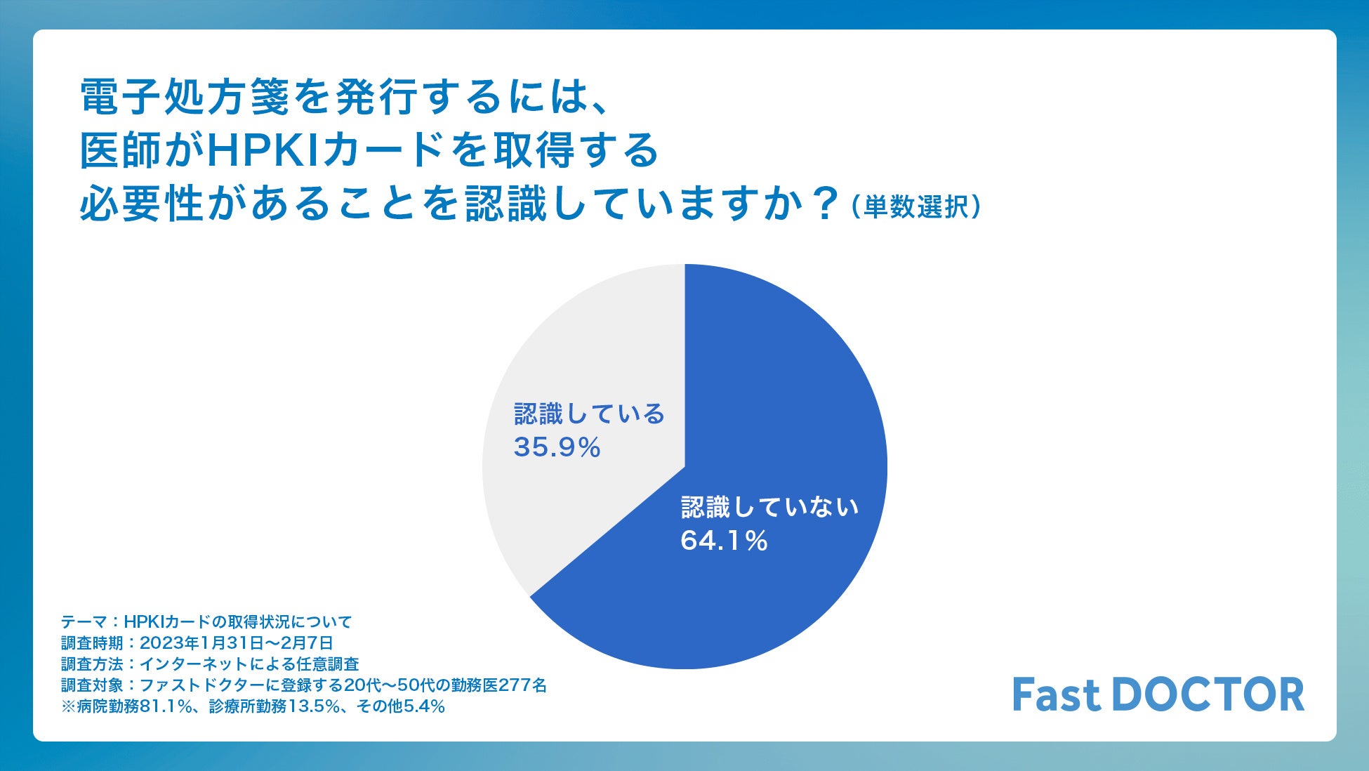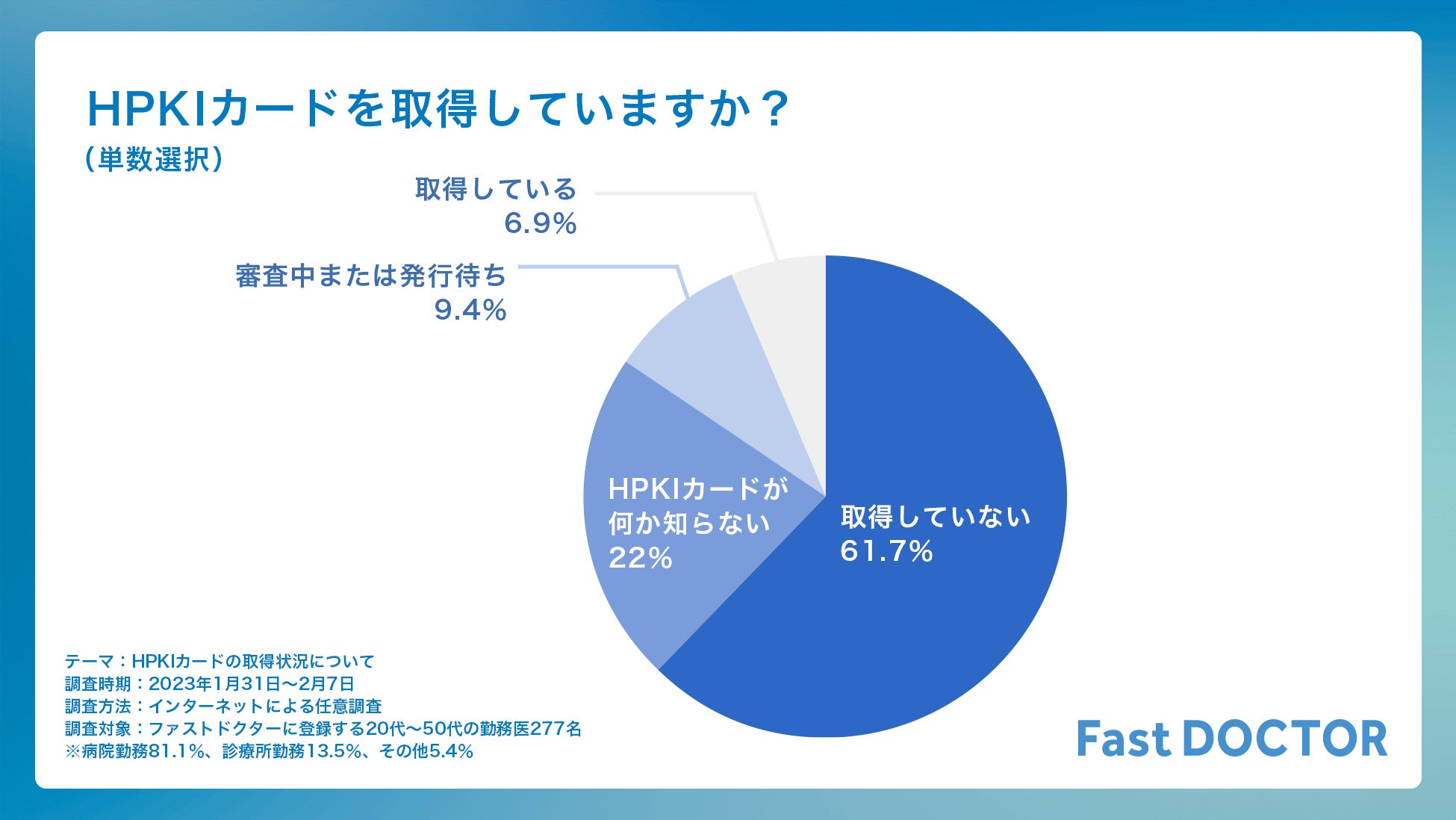 日本最大級の医療プラットフォームを運営するファストドクター株式会社[本社:東京都港区、代表取締役:菊池 亮(医師)、水野敬志]は、同プラットフォームに登録し、アンケート調査への協力が得られた医師277名を対象に、2023年1月26日から全国で運用が開始された電子処方箋の取扱いに必要な「HPKIカード※の取得状況と普及方法の把握」を目的とした実態調査を実施しました。