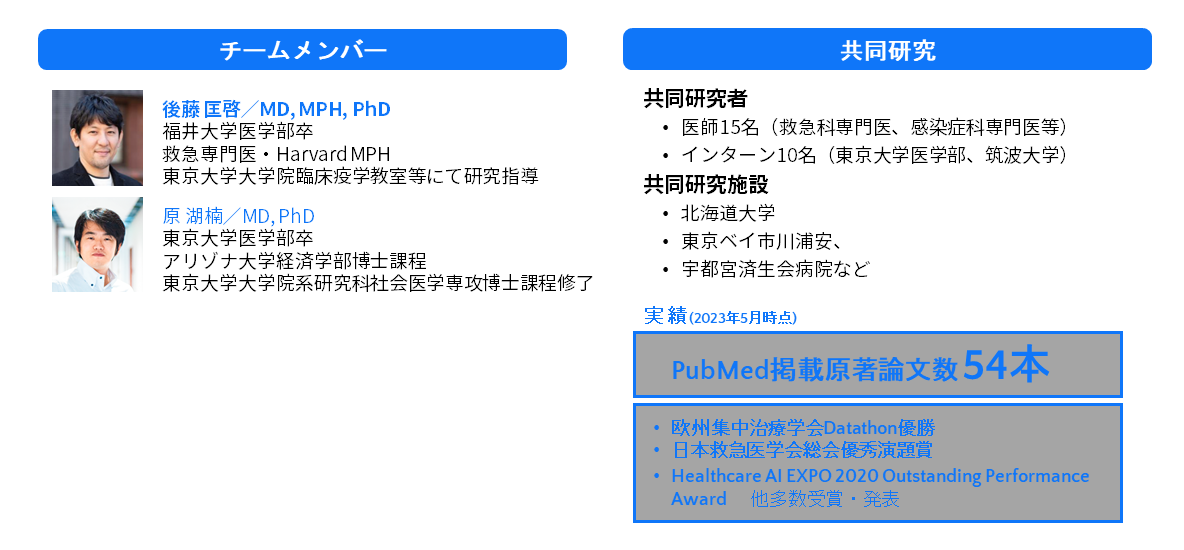 TXP Medicalは様々な領域の専門医・看護師・救急救命士・疫学専門家・生物統計家・医学生など約30名からなるリサーチチームを擁しています。自社プロダクトの科学的妥当性を検証するだけでなく、企業とアカデミアの融合を目指し学術発信を行うチームで、スタートアップでは類を見ない学術機関に匹敵するものです。