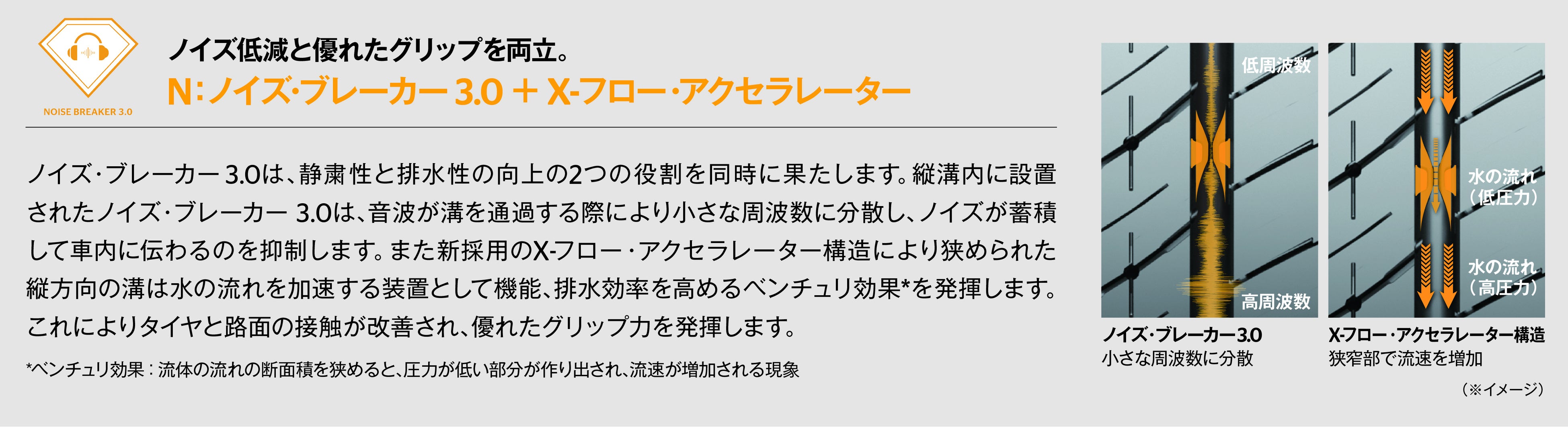 ノイズ・ブレーカー 3.0が、縦溝内を通る音波を遮断し、分解・分散させることで、ノイズが蓄積して車内に伝わるのを抑制するだけでなく、新採用のX-フロー・アクセラレーター構造により狭められた縦方向の溝部分にベンチュリ効果*が発生することで、水の流れが加速して排水効果が高まり、優れたウェットグリップ力を発揮します。静粛性の高いタイヤは、ドライバーのストレスを低減し、より快適なドライビングを楽しんでいただくことができます。
