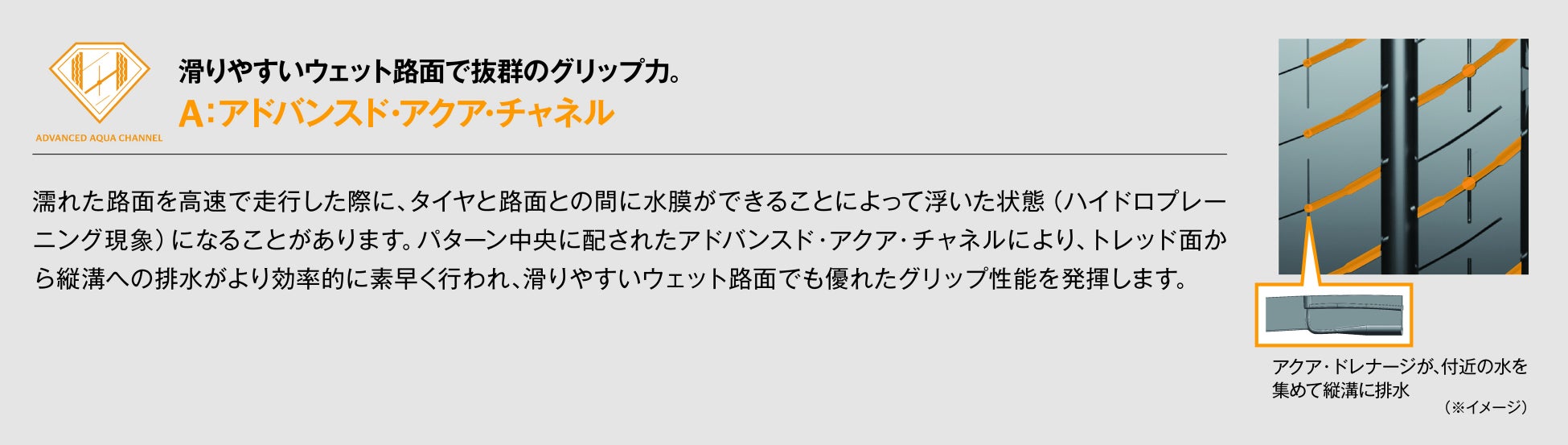前モデルから進化したアドバンスド・アクア・チャネルは、タイヤと路面の間の水幕を効率よく、素早く縦溝に排出。ハイドロプレーニングの発生を抑制し、濡れた滑りやすい路面で優れたグリップ力を発揮することで、ウエット・ブレーキング性能と安全性の向上に大きく貢献しました。