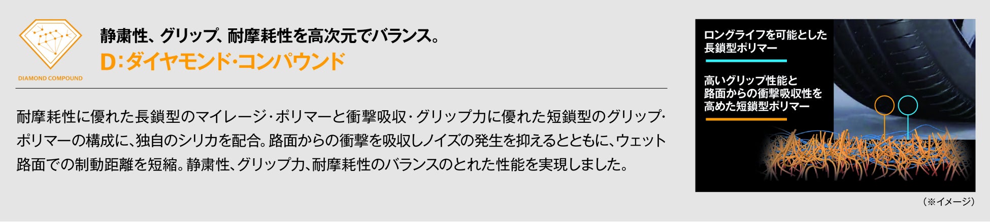 独自のシリカとレジンを配合したダイヤモンド・コンパウンドは、運動エネルギーを最適なレベルで熱に変換し、濡れた路面での制動距離の短縮に寄与しています。また最適化されたポリマーネットワークが、ノイズの発生を抑制し、優れた耐摩耗性を実現しました。いざと言うときでもしっかり止まるグリップ力と長期の使用に耐えるロングライフ性能は、ドライバーに大きな安心感と満足感を提供します。