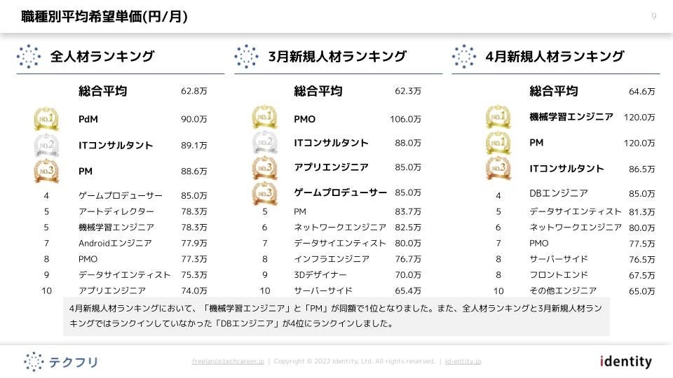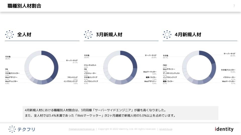 ITフリーランスエンジニアの案件・求人サイト「テクフリ」(https://freelance.techcareer.jp/)を運営する株式会社アイデンティティー(東京都新宿区、代表取締役:今野 力、以下「当社」)は、テクフリのデータベースを元に2022年4月における人材の市況感を調査しました。より詳しい結果については、お問い合わせからダウンロードいただけます。