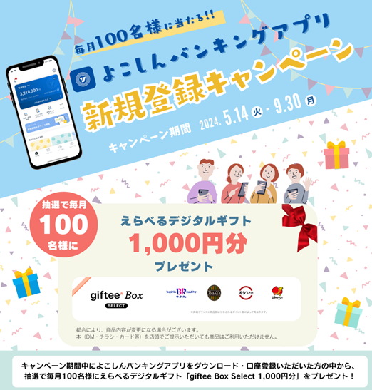 対象期間中にアプリをダウンロードして口座登録いただいた方から毎月抽選で100名様にえらべるデジタルギフト1,000円分をプレゼントします。
