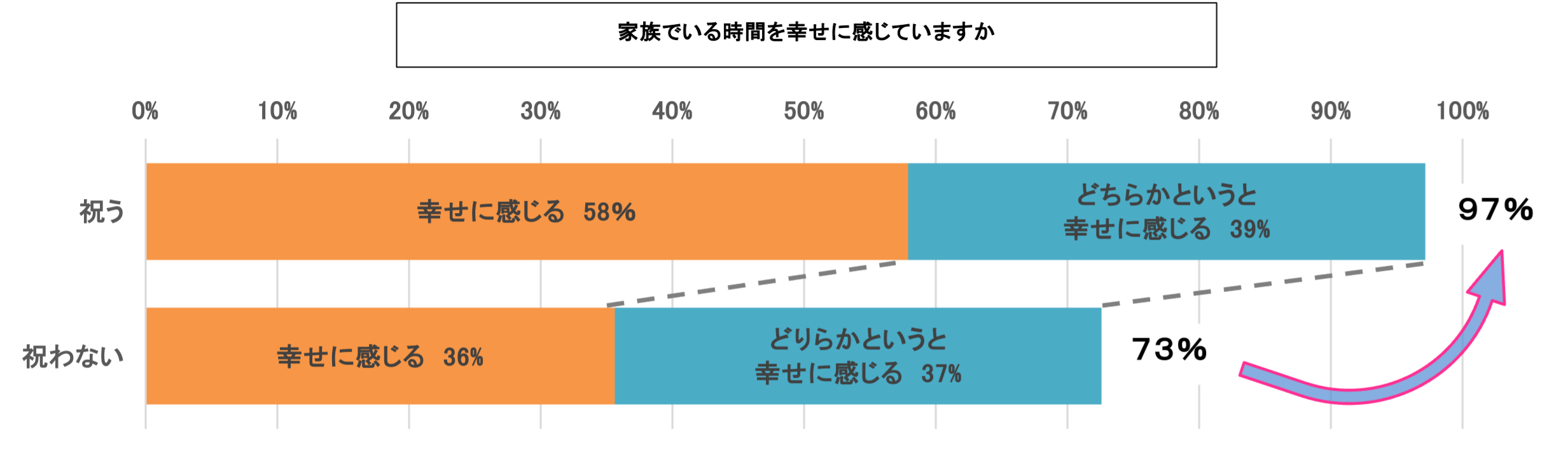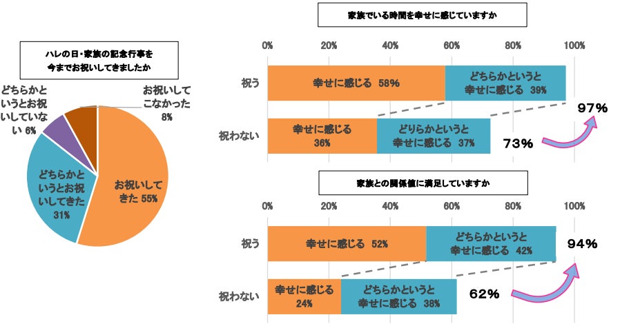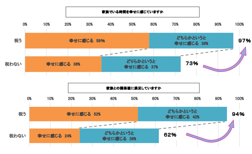 家族でいる時間を幸せに感じていますかとお聞きしたところ、「幸せに感じる」と回答した比率は、記念行事を実施している方が97%、実施していない方は73%となりました。また、「家族との関係値に満足している」と回答した比率は、記念行事を実施している方が94%、実施していない方は62%となり、家族の記念行事実施度が高い方が、合計56%家族の幸福度も高い傾向にあることがわかりました。