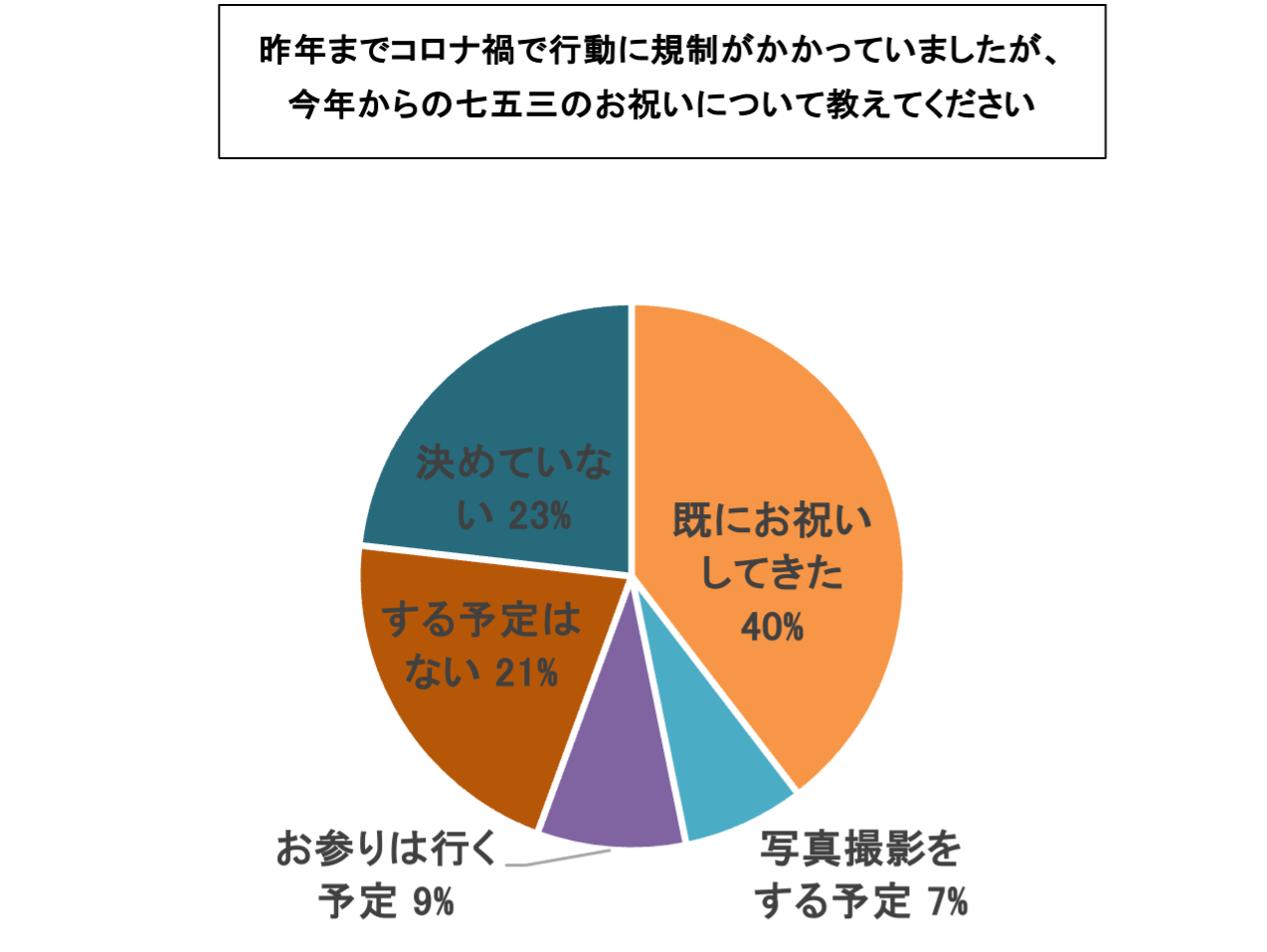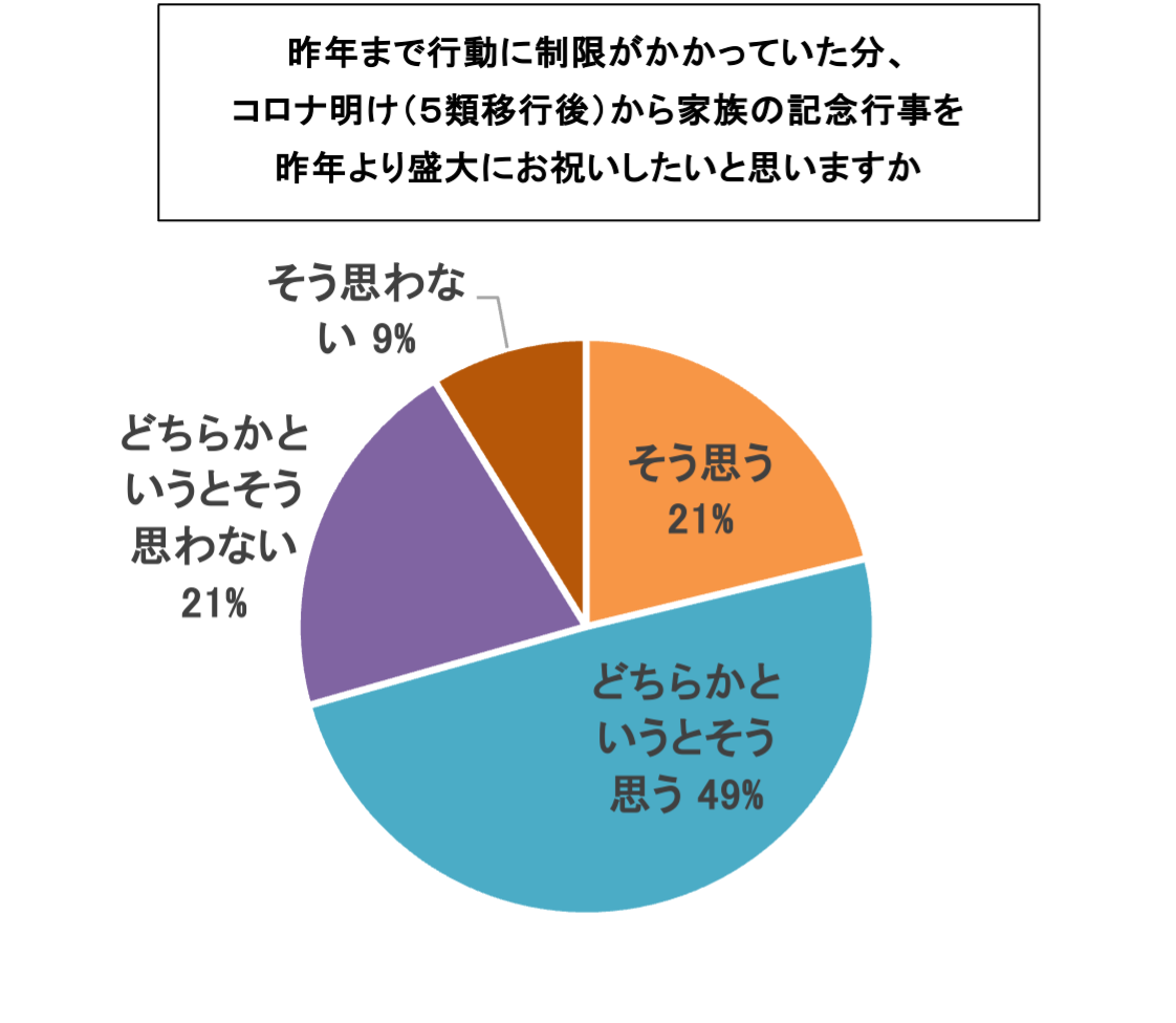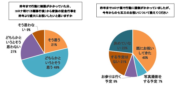 昨年までコロナ禍で行動に規制がかかっていた中、コロナ明け(5類移行後)から、家族の記念行事を昨年より盛大にお祝いしたいかお聞きしたところ、「そう思う」が21%、「どちらかというとそう思う」が49%と回答。70%の方は行動制限が明けたことで、より家族の記念行事に前向きになっていることがわかりました。 また、今年からの七五三のお祝いについてお聞きしたところ、「既にしている・してきた」が40%、「写真撮影をする予定」が7%、「お参りは行く予定」が9%と、56%の方が七五三のお祝いをすることが明らかになりました。七五三のお祝いをしてきた方や予定している方は過半数を超えており、終えた方から感想を聞いたところ、は「着物など大変なこともあるけど、祝うことで成長の節目を感じられた」「下の子がちょうどコロナ禍で規制がかかったタイミングだったので、今年は家族で大切な記念写真を撮れてよかった」「コロナ大流行時期よりもあまり制限もなくゆったりとお祝いすることができた」などと、お祝いや記念写真を撮って良かったという声がいくつもありました。