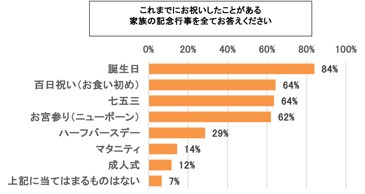 今までに家族の記念行事(マタニティ、お宮参り、百日祝い(お食い初め)、ハーフバースデー、誕生日、七五三、成人式)をお祝いしてきたかについてお聞きしたところ、「お祝いしてきた」が55%、「どちらかというとお祝いしてきた」が31%と、86%の方が家族の記念行事をお祝いしてきた結果に。どの子育て世代の多くがも家族の記念行事を大切にしていることがわかりました。また、お祝いしたことがある記念行事の中では、「誕生日」が84%と最多となり、「百日祝い(お食い初め)」、「七五三」が64%実施経験があると回答。誕生日を除いて過半数以上が百日祝い(お食い初め)や七五三など子どもの成長の節目でお祝いをしている傾向が高いことが、明らかになりました。