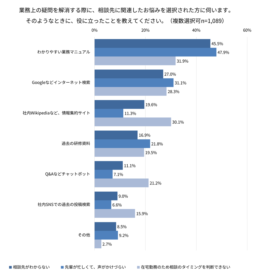「先輩が忙しくて、声がかけづらい」「相談先がわからない」「在宅勤務のため相談のタイミングを判断できない」と回答した方に、そのようなときに役に立ったものを聞くと「わかりやすい業務マニュアル」が第1位でした。