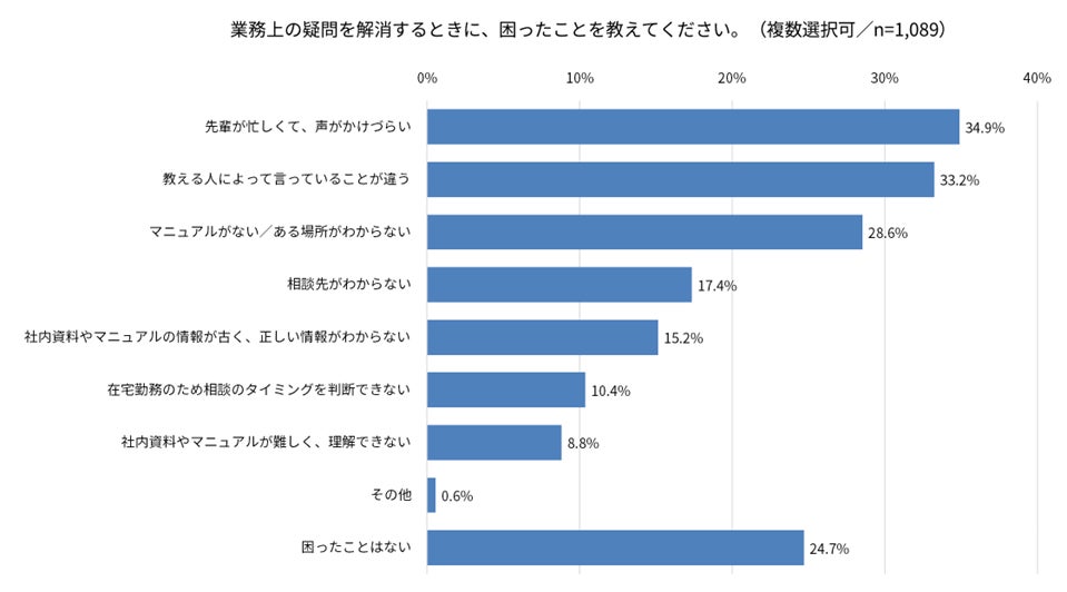 業務上の疑問を解消する際に困ったことを質問すると、第1位は「先輩が忙しくて、声がかけづらい」(34.9%)でした。次いで「教える人によって言っていることが違う」(33.2%)、「マニュアルがない/ある場所がわからない」(28.6%)が続きました。