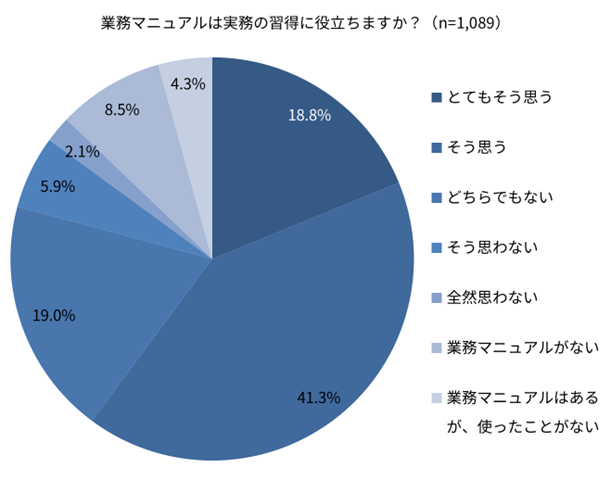 「業務マニュアルは実務の習得に役立ちますか?」と聞くと、6割が「役に立つと思う」(とてもそう思う:18.8%、そう思う:41.3%)と回答しました。具体的なコメントもあわせて紹介します。