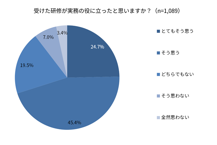 受けた研修が実務の役に立ったか聞くと、7割が「受けた研修が実務の役に立ったと思う」(とてもそう思う:24.7%、そう思う:45.4%)と回答しました。具体的なコメントもあわせて紹介します。