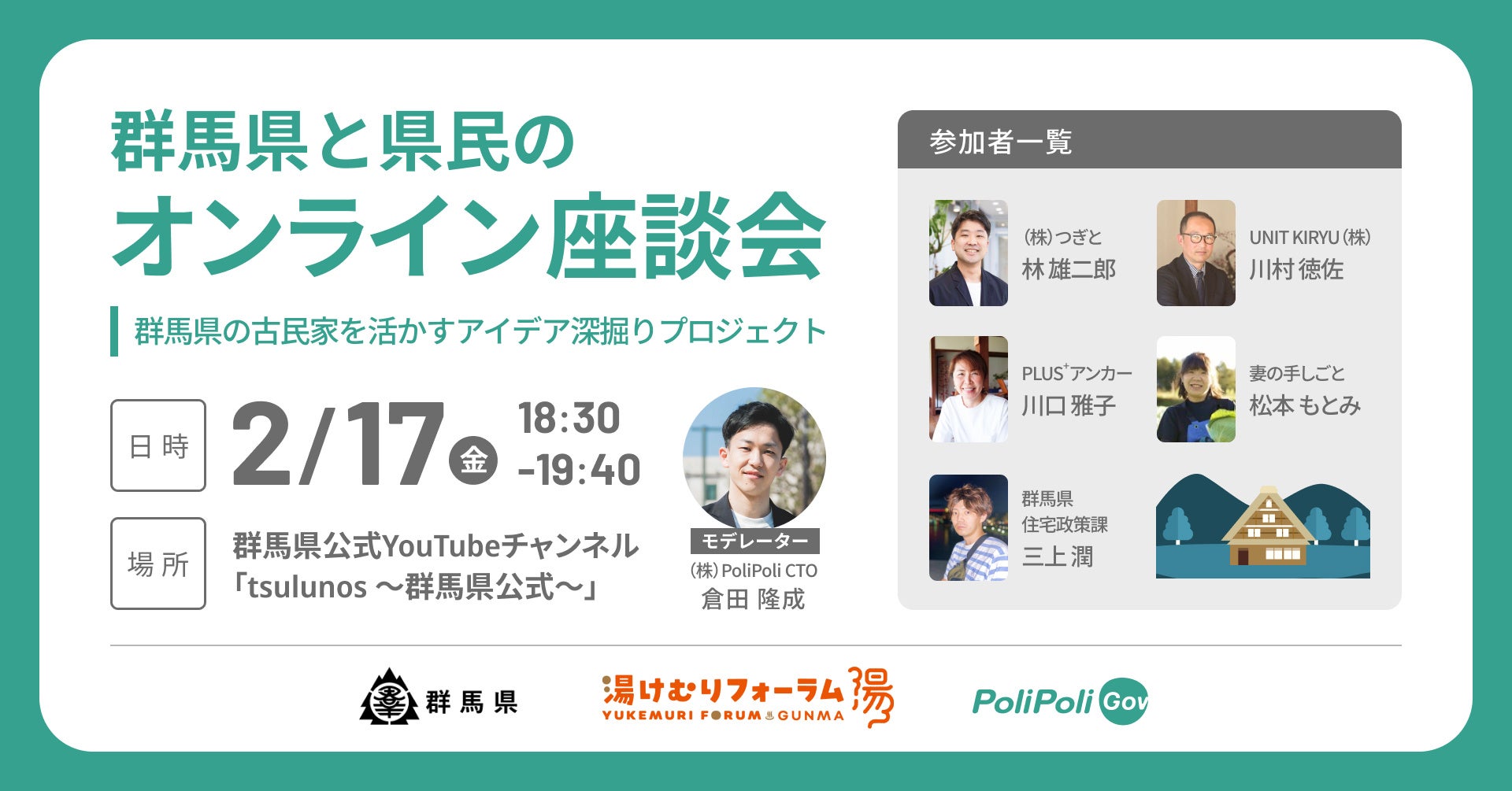 このたびPoliPoli Gov (β版) にコメントを寄せていただいた方数名と、群馬県の担当課や古民家再生・活用事業に関わる方々によるオンライン座談会を実施いたします。