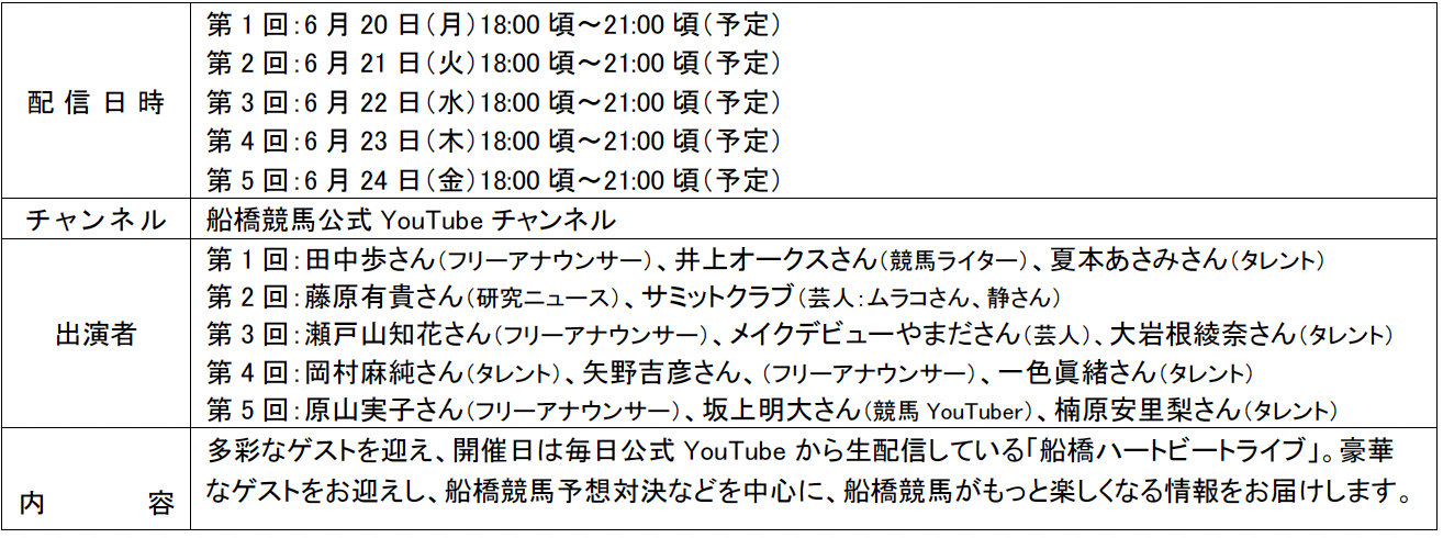 「船橋競馬公式 YouTube チャンネル」https://www.youtube.com/channel/UCfnIcvhLkVVCTd86yemmGnQ/featured