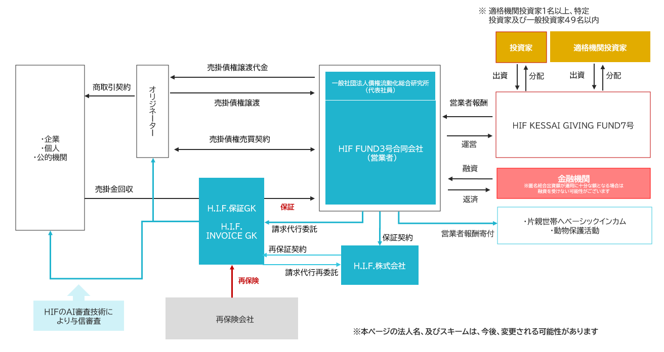 ・保証:ファンドが保有する売掛債権には、保証会社⼜はH.I.F.もしくは両方による売掛金保証が付保されております。(公的機関等に対する債権は除く)