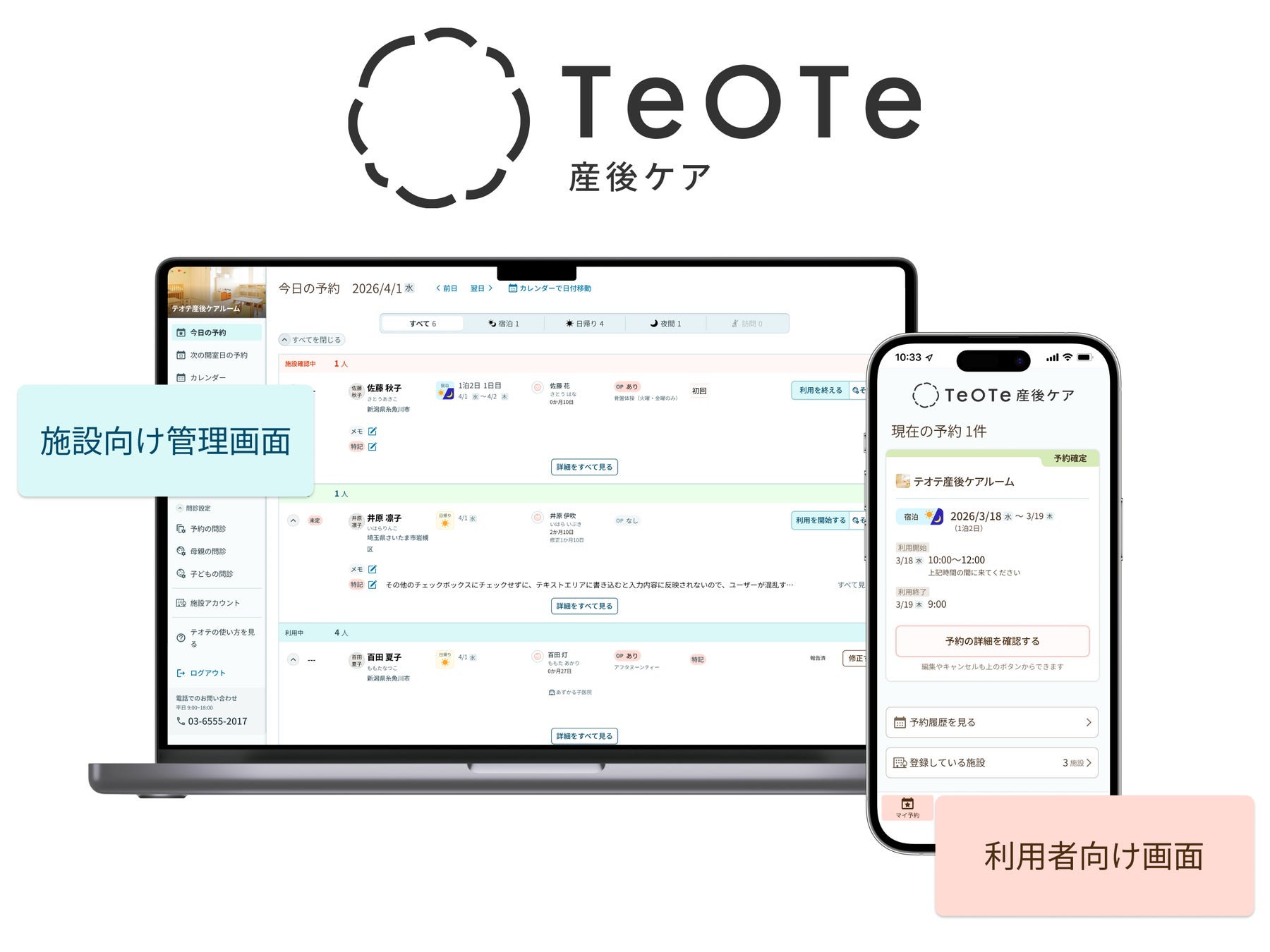 テオテ産後ケアは、産後の母親が利用できる産後ケア施設の検索や予約をオンラインで支援するサービスです。利用者にとって使いやすいだけでなく、事業を運営する産後ケア施設のスタッフも、煩雑な事務作業から解放され、業務に集中できます。また、自治体単位でシステム導入すると、地域にある委託先の産後ケア施設の情報を一元管理できます。昨年度よりサービスを開始し、現在157施設、8自治体(糸魚川市、上尾市、横須賀市、枚方市、神戸市、札幌市、明石市、松本市)に拡大中です。