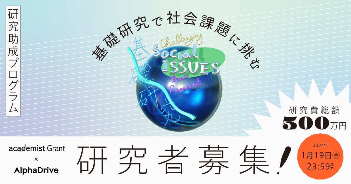 株式会社アルファドライブ(代表取締役社長 兼 CEO:麻生要一、以下、AlphaDrive)の企業の研究開発(R&D)部門向け支援機能「R&D Incubation Center」は、2023年11月27日(月)より学術系クラウドファンディングを展開するアカデミスト株式会社(代表取締役 CEO:柴藤亮介、以下アカデミスト)と連携し、世の中の社会課題解決に挑む研究者の募集を開始しました。採択された研究者にはビジネス視点でのメンタリングと、500万円の研究資金を分配寄付します。
