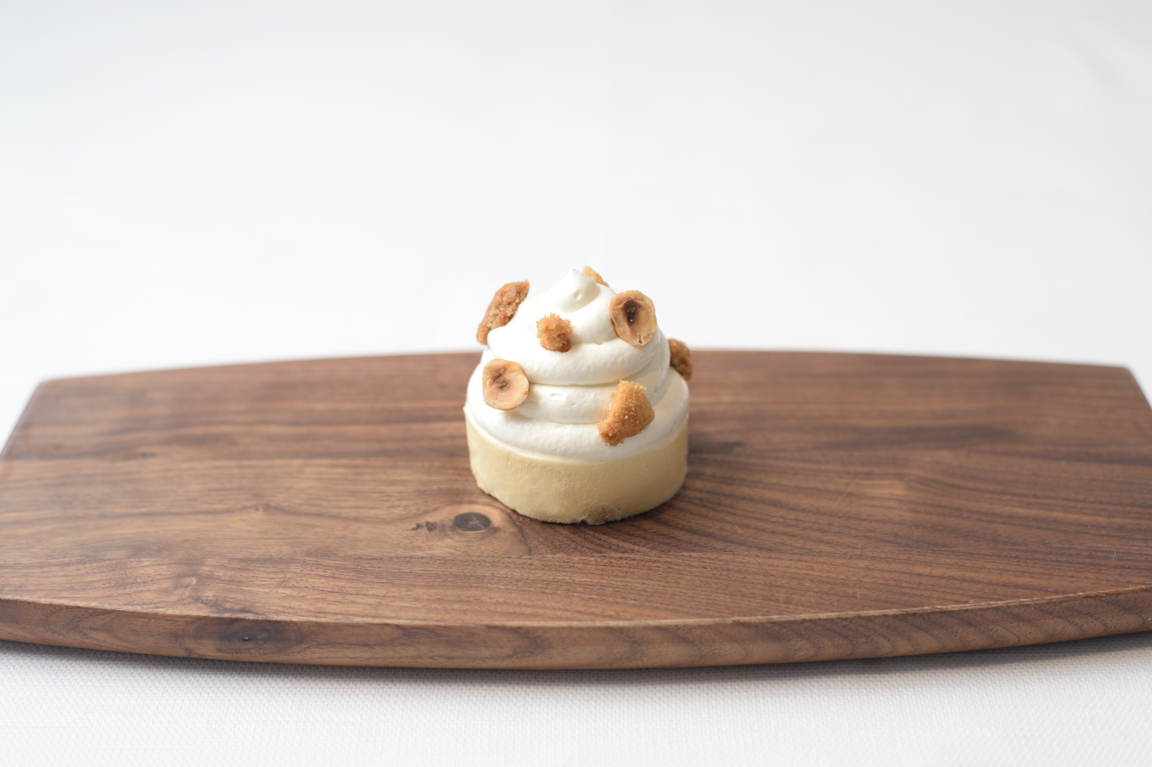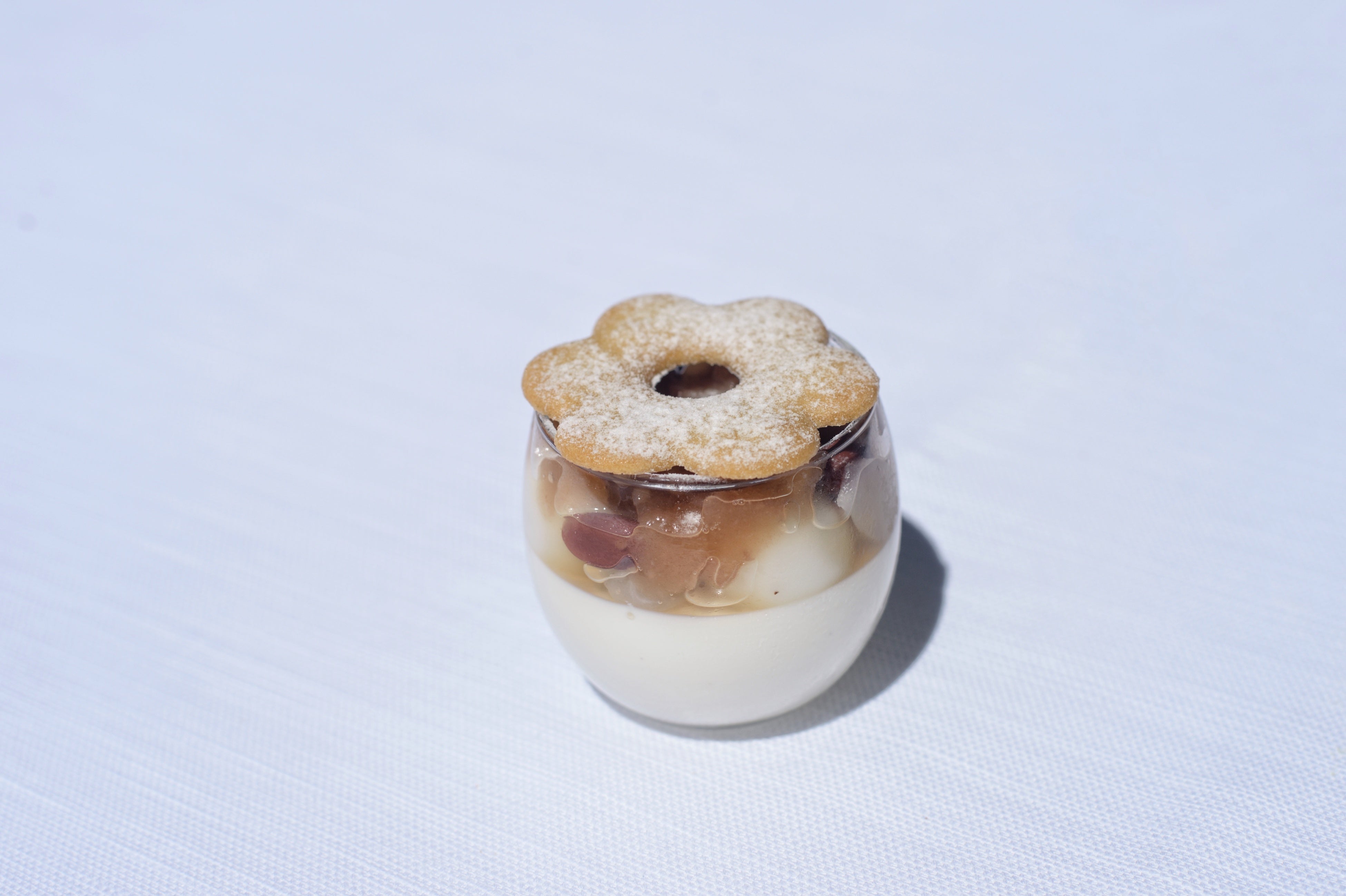 沖縄県ではおなじみの甘味「ぜんざい」を洋風スタイルにアレンジしました。ココナッツソースを閉じ込めたパンナコッタをベースに、沖縄ぜんざいゼリーに白玉だんごとライチをあしらい、こちらも沖縄ではおなじみの月桃を使用したサブレをのせました。ぜんざいのほど良い甘さと、ライチの爽やかさが見事にマリアージュされています。