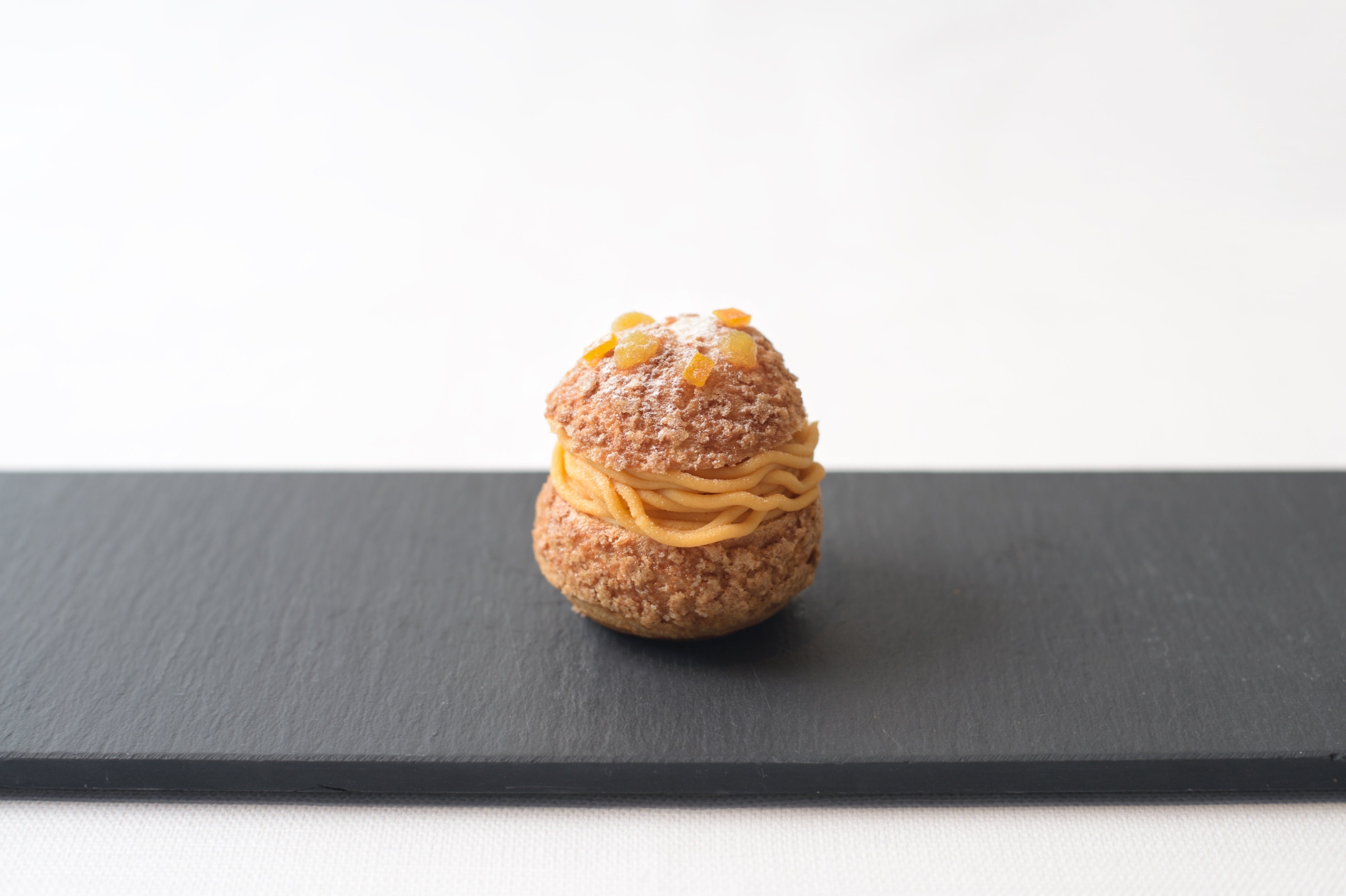 輝くような濃い黄色と「天然のスイーツ」と言われるほどの強い甘みが特徴の黄金(くがに)芋を使用したシュークリーム。クリームには、生クリームとカスタードクリームを混ぜ合わせたうえに、マーマレードをエッセンスとして加えることで濃厚で上品な味わいに仕上げました。パティシエのアイディアが際立つスイーツです。