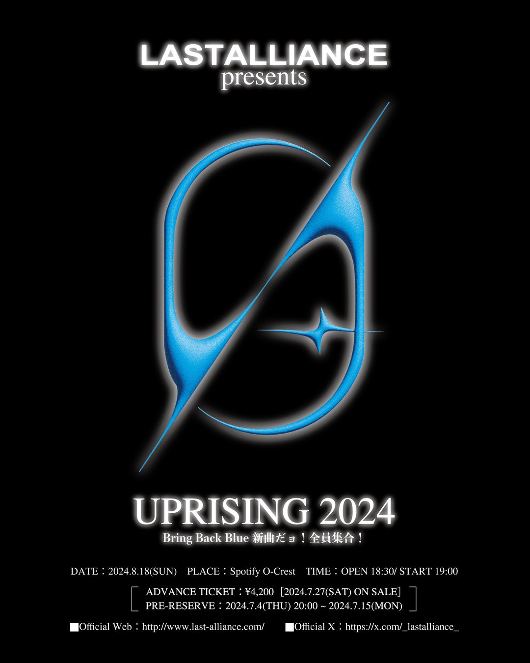 8月18日(日)には東京・渋谷Spotify O-Crestにてリリースライブイベント、LAST ALLIANCE presents「UPRISING 2024 〜Bring Back Blue 新曲だョ!全員集合!」の開催も発表された。