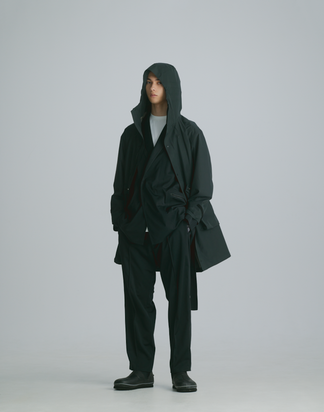 表地にニットのGORE-TEX INFINIUM™プロダクトを採用したガウンジャケット。可能な限りステッチを見せないミニマルな仕様で、耐水性、撥水性を持ちながらソフトな風合いを実現しました。肩回りは機動性の高いラグランスリーブ。袖付け、脇の切り替え部分にはシームシーリングを施し防水性をアップ。ウエストベルトを調整することで、シルエットやスタイリングの変化が楽しめる一着です。