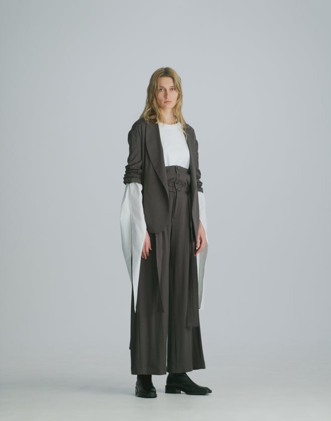 上質なウールを使用した、ラウンジ調のジャケットとハイウエストパンツのラグジュアリー感あるセットアップ。ニット素材のためストレッチ性があり、しわになりにくく、自宅の仕事着としてもストレスなく着られます。素材には、イタリア老舗梳毛メーカーREDA社のウール天竺で、機能性に特化して開発された生地「REDA ACTIVE」、SUPER120'sのニュージーランド産ウール(ZQメリノ)に、撥水加工を施したD-VECの特注素材を使用。原料の良さが活きた風合いと光沢感があります。毛羽が少ないのでチクチクすることなく、またウール本来のもつ防臭性も兼ね備えた、着心地・機能共に申し分のない一着です。