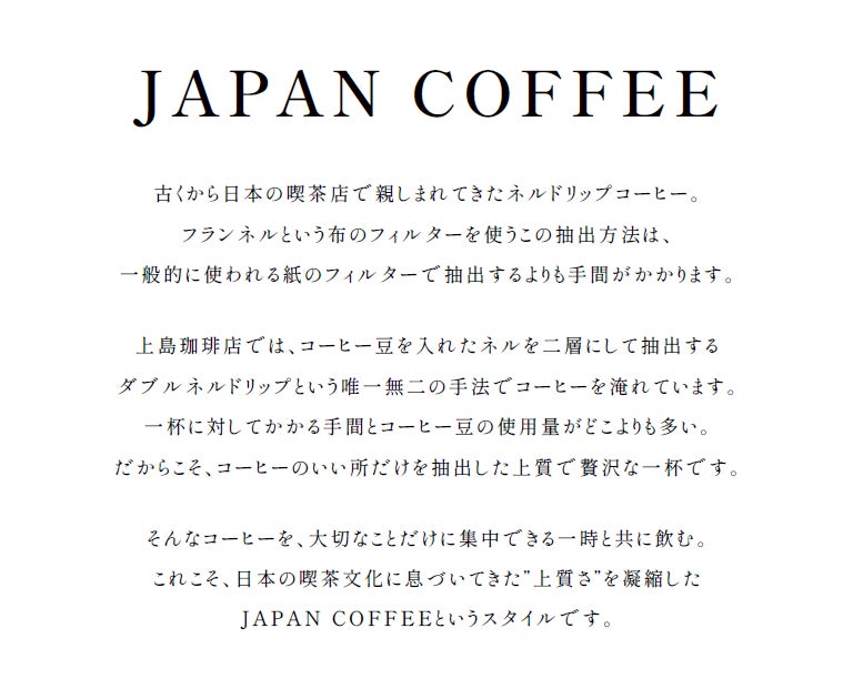『JAPAN』とは、「ダブルネルドリップコーヒー」に、日本文化を代表する「南部鉄器」で沸かした白湯をアドオンした(加えた)まったく新しいスタイルのコーヒーです。「ダブルネルドリップコーヒー」に、口当たりが優しく柔らかな味わいの白湯が融合し、コク豊かでありながらも、優しくクリアな味わいを実現しています。他の誰にも真似できない一杯にこだわり続けた上島珈琲店の情熱が込められています。その一杯を、そしてその姿を、ぜひご堪能ください。