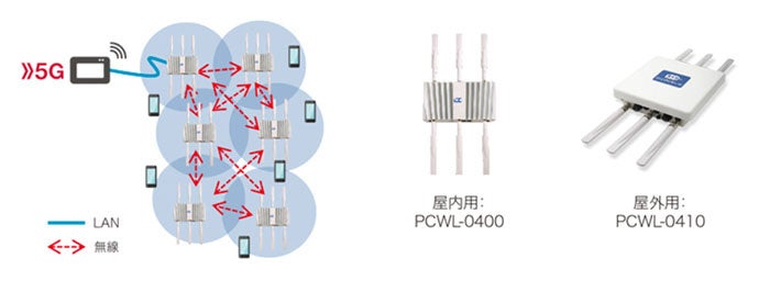 従来、本公園のような広大なエリアに一時的なWi-Fiエリアを構築するのは、LAN配線の敷設にコストがかかるだけでなく設営のための期間も必要なため、実現が困難でした。PicoCELAのエンタープライズ無線メッシュ技術を活用したマルチホップWi-Fiは、LAN配線が難しい広大なエリアに、安価で容易にWi-Fiエリアを構築できるソリューションです。一般的なWi-Fiメッシュでは、マルチホップすると3台以下でも安定した通信を得ることが難しい場合がありますが、PicoCELAの技術を用いると、5台以上のマルチホップでも安定した通信を維持できることから、最小限のLAN配線による機動的な設営・撤収作業が可能となります。今回の実験では5G高速大容量通信をWAN回線として活用し、PicoCELAのソリューションと組み合わせることでバックホール回線の完全無線化を実現します。